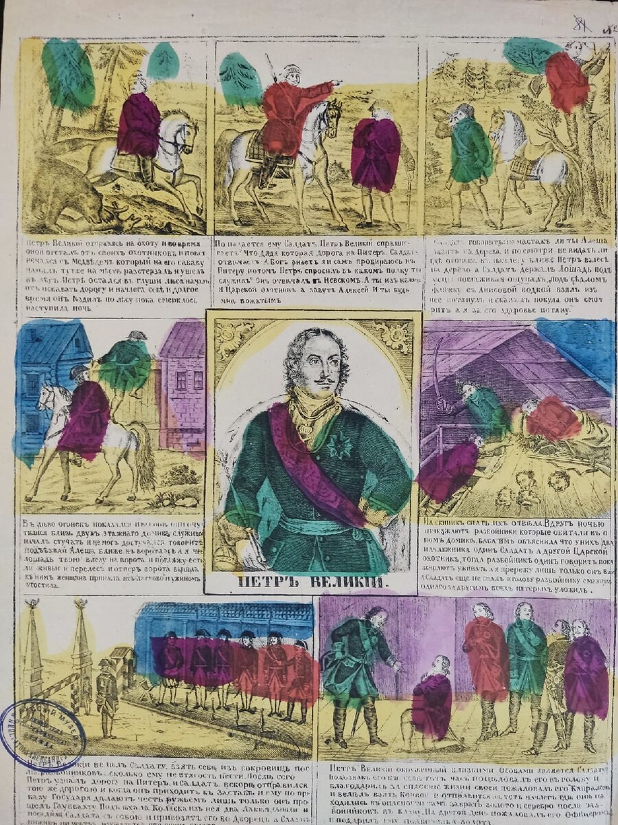 Но уже в XVII веке появились печатные мастерские. Спустя столетие император Петр I основал в Москве гравировальную палату, там работали лучшие художники, которые обучались в Европе. На смену деревянным доскам пришли медные пластины. Художники тонким резцом гравировали штриховкой рисунок со всеми мелкими подробностями, чего невозможно было сделать на липовой доске. Знаменование разделилось на знаменование и гравировку. Знамёнщик наносил рисунок, гравёр вырезал его на доске или металле. Способ расцветки картин оставался тот же. Артельщики принимали заказы на раскраску сотен тысяч экземпляров. Один человек за неделю раскрашивал до одной тысячи лубков – за такую работу платили один рубль. Профессия называлась цветальщик. Профессия исчезла после появления литографских машин.