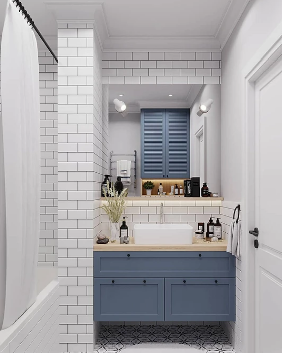 Белая ванная комната дарит атмосферу чистоты и релаксации. Но если использовать белый цвет во всем есть риск получить что-то похожее на больницу. Рассказываем, как разнообразить белое однотонное пространство и сделать интерьер интересным. Цветная сантехника и мебель Яркие акценты оживят интерьер: это может быть цветная тумба, смеситель или шторка. Натуральные материалы Белый цвет и дерево — гармоничный союз в дизайне. Деревянные столешницы, полки, небольшие столики, плетённые корзины станут идеальным дополнением вашего интерьера. Зелень Живые или искусственные растения также могут быть хорошим акцентом. Выбирайте растения с учётом высокой влажности в ванной комнате и маленького количества света (например, плющ, бамбук, мох). Выделяйте пол Добавить красок можно и при помощи пола, внедрив в него более темные или цветные оттенки. Фактурная плитка Иногда однотонные объемные орнаменты и узоры могут привлечь больше внимания, чем яркие краски. Цветная затирка Белую плитку и мозаику можно соче