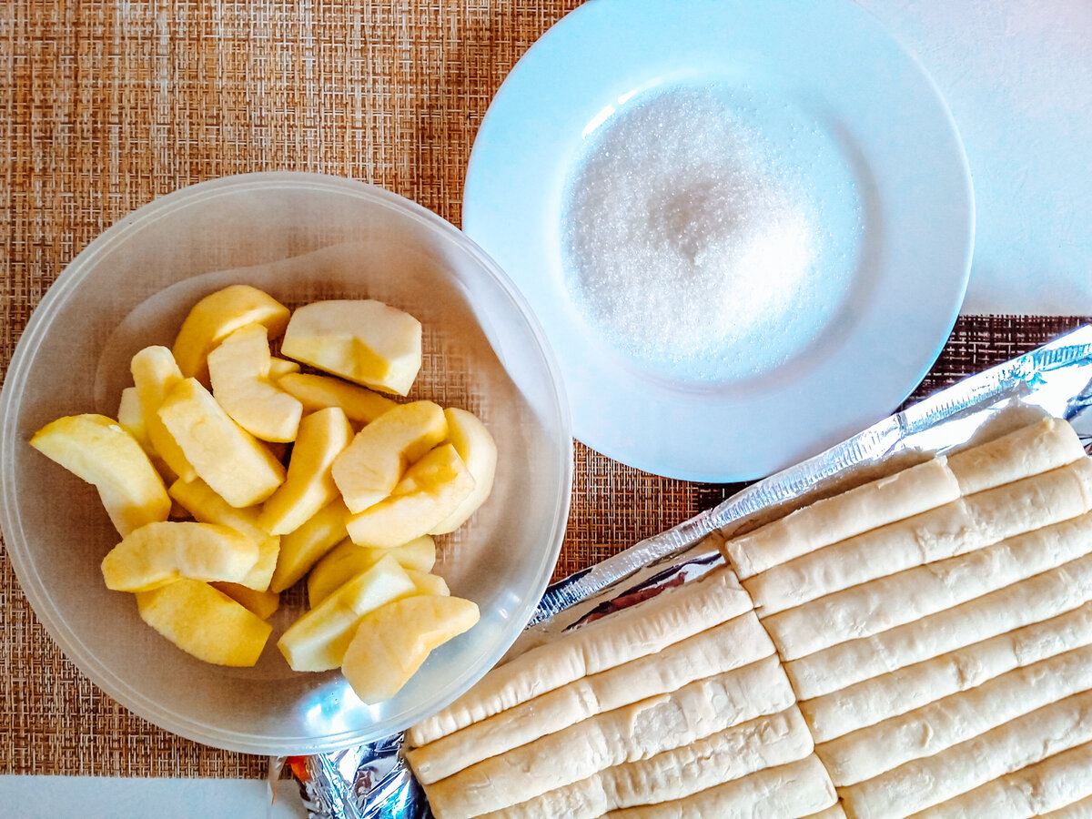 Фрукты и слоеное тесто сочетаются идеально. Получается легкий и вкусный десерт или выпечка на раз-два! Предлагают простые плюшки с яблоком. Вам потребуется: Приготовление 1. Тесто размораживаем и режем на полосочки примерно 1-1,5 см шириной. Их получается 16-20 штук. 2. Яблоки моем, режем на дольки,, вынимаем косточки. 3. Кладем на тарелочку с сахаром и обваливаем со всех сторон. 4. Берем полоску теста и обматываем вокруг яблока. Получается такая "куколка". 6. Через 20 минут у вас полный противень вкусноты. Если яблок не хватило, мокаем полосочки теста в сахар и закручиваем улиток. У меня на фото слева. Тоже очень вкусно. 7. Выпекаем при температуре 180 градусов минут 20, следим за цветом. Приятного чаепития. Также можно закручивать грушу, вишню - да, да по одной ягодке в кусочек теста с сахаром - ммм, объедение, такие вкусные шарики получаются. Вам нравится? Буду рада, если подпишитесь на мой канал.
