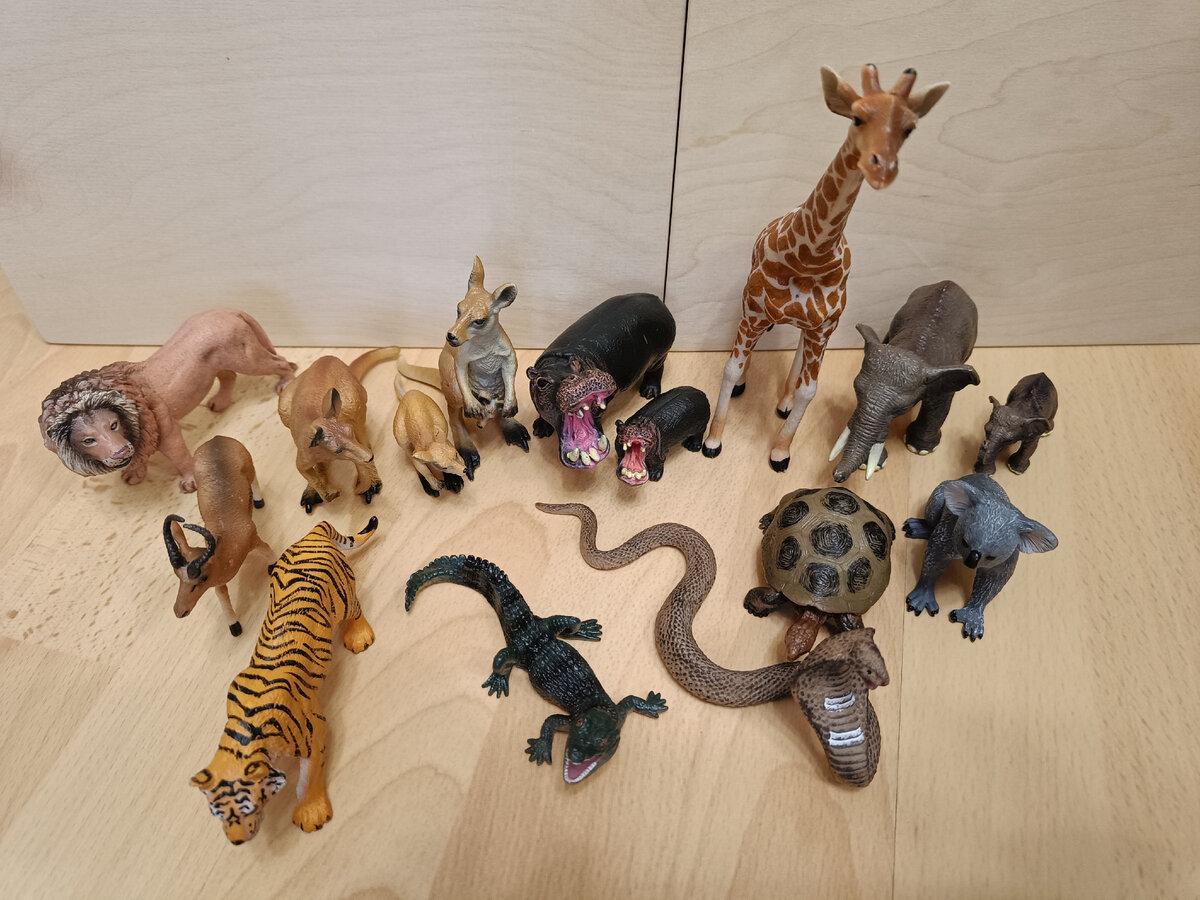 На мой взгляд реалистичные фигурки животных очень полезны для развития ребёнка. Фигурки помогают познавать окружающий мир животных, ведь не всегда есть возможность показать как выглядит животное в реальности. И ещё можно придумать интересные и полезные игры с фигурками. У Матвея на данный момент небольшая коллекция, но регулярно её пополняю. Какие же игры можно придумать с фигурками? Самая простая - это сказать ребенку как называется животное, показать его и какие звуки издает, чтобы ребенок запоминал. Затем можно и нужно усложнять: поставить перед ребенком 3 разных фигурки и попросить показать пальчиком или дать вам в руки определенное животное (это можно уже пробовать с 10 месяцев точно, возможно кто-то будет и раньше). И потом, придя в зоопарк ребенку будет легче узнавать животных. Если есть карточки с животными или книга, то показывать (а потом и просить ребёнка) сопоставить фигурку с изображением на картинке. У нас книга. Когда Матвей уже научился сам имитировать звуки животных