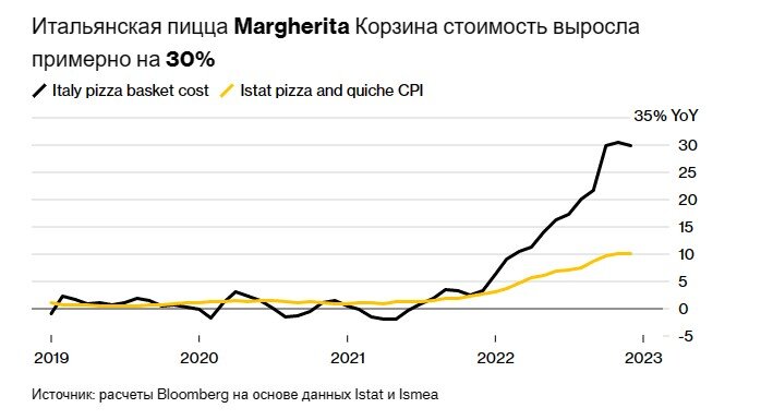 Автор - basil10 # Наслаждение одним из классических блюд Италии стало заметно дороже, а средняя стоимость приготовления пиццы Маргарита выросла почти на 30% в декабре по сравнению с прошлым годом. Это намного превышает уровень инфляции в прошлом месяце в 12,3%, что было обусловлено ростом цен на энергию и продовольствие. Анализ квинтэссенции неаполитанского тарифа раскрывается новым ежемесячным индексом Pizza Margherita От Bloomberg, целью которого является дать представление о шоке стоимости жизни для итальянцев, оценив компоненты приготовления одного из самых известных и простых блюд в стране. Анализируя данные Национального института статистики Италии и министерства финансов, индикатор отслеживает рост цен на основные ингредиенты — муку, помидоры, сыр моцарелла и оливковое масло. Мы также предположили потребление электроэнергии, необходимое для приготовления пиццы с домашней электрической духовкой. Стоимость изготовления его в домашних условиях выросла гораздо быстрее, чем выбор з