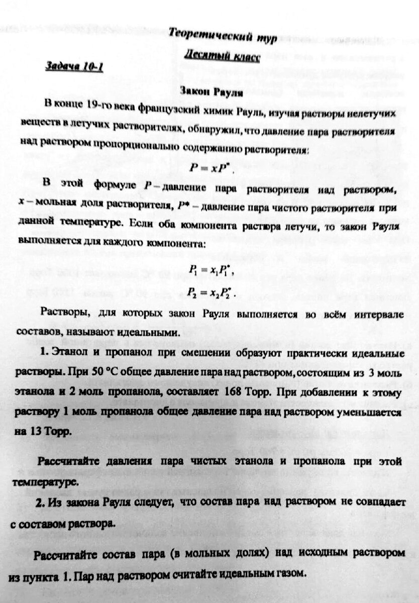 Только вчера химики - олимпиадники решали, пожалуй, самый сложный этап ВСЕРОССа - региональный. Обмен впечатлениями в чатах не утихает и многим ребятам регион этого года показался прям очень сложным. Мне интересны были задания для 10-го класса, а задача по физической химии порадовала и тем, что была взята новая тема, которой раньше не было на олимпиадах, и своей простотой. Вот она: Разберёмся. 1. Если изначально в смеси было 3 моль этанола и 2 моль пропанола, то это соответствует мольным долям обоих компонентов 0,6 и 0,4. Тогда выражение для закона Рауля можно записать так: 0,6 х Р*(этанола) + 0,4 х Р*(пропанола) = 168 После того, как к смеси добавили ещё 1 моль пропанола, мольные доли компонентов изменились и стали равны 0,5 и 0,5. Тогда: 0,5 х Р*(этанола) + 0,5 х Р*(пропанола) = 155 Решая эту простую систему уравнений получаем значения давления пара для каждого спирта: Р*(этанола) = 220 торр и Р*(пропанола) = 90 торр. 2. Состав исходного раствора - это 0,6 мольных долей этанола и 0,