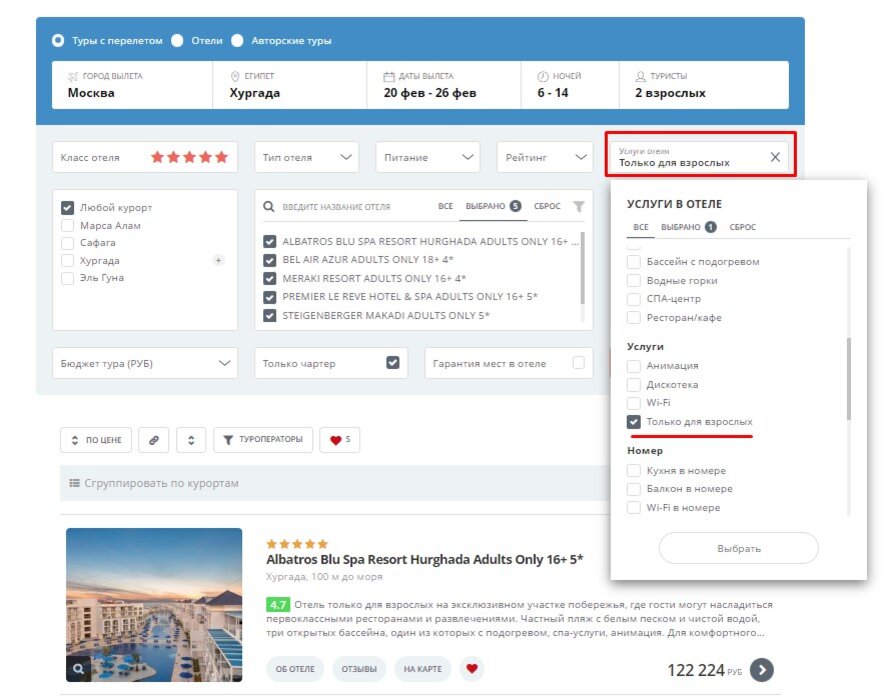 Кстати, для релевантной поисковой выдачи на Tourvisor возможно сделать сортировку отелей по фильтру «только для взрослых». Плюс понравившиеся объекты доступно отметить в поиске ❤️, чтобы они попали в ваш список избранных.
