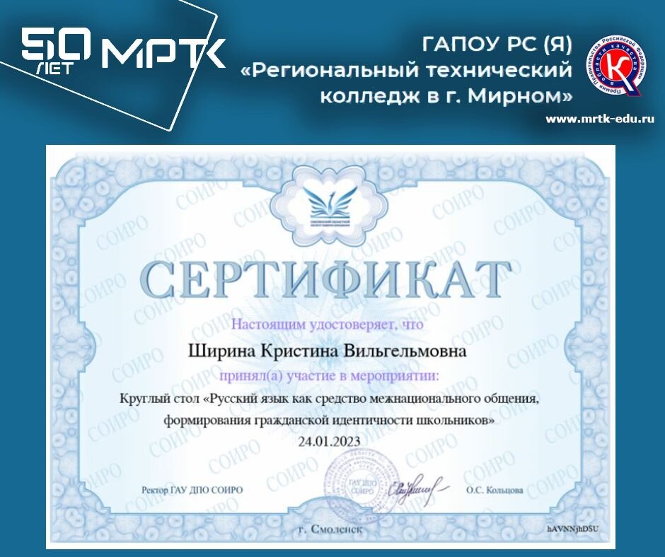 «Удачнинское отделение rорнотехнической промышленности»: «Русский язык – это путь цивилизации и культуры». В январе 2023 года преподаватель «Удачнинского отделения горнотехнической промышленности» ГАПОУ РС(Я) «МРТК» Кристина Ширина приняла участие в дистанционном межрегиональном круглом столе «Русский язык как инструмент формирования гражданской идентичности обучающихся и культуры межнационального диалога», проводимом Смоленским областным институтом развития образования. Цель и задачи круглого стола – повышение качества преподавания предмета «Русский язык»; обобщение существующих практик и инструментов повышения воспитательного потенциала урока русского языка. На мероприятии были представлены материалы для обсуждения видов и форм учебной деятельности педагога в процессе изучения русского языка; исследовательская и проектная деятельность обучающихся на уроках русского языка. В рамках круглого стола Кристина Вильгельмовна представила статью «Театрализация на уроках русского языка и ли