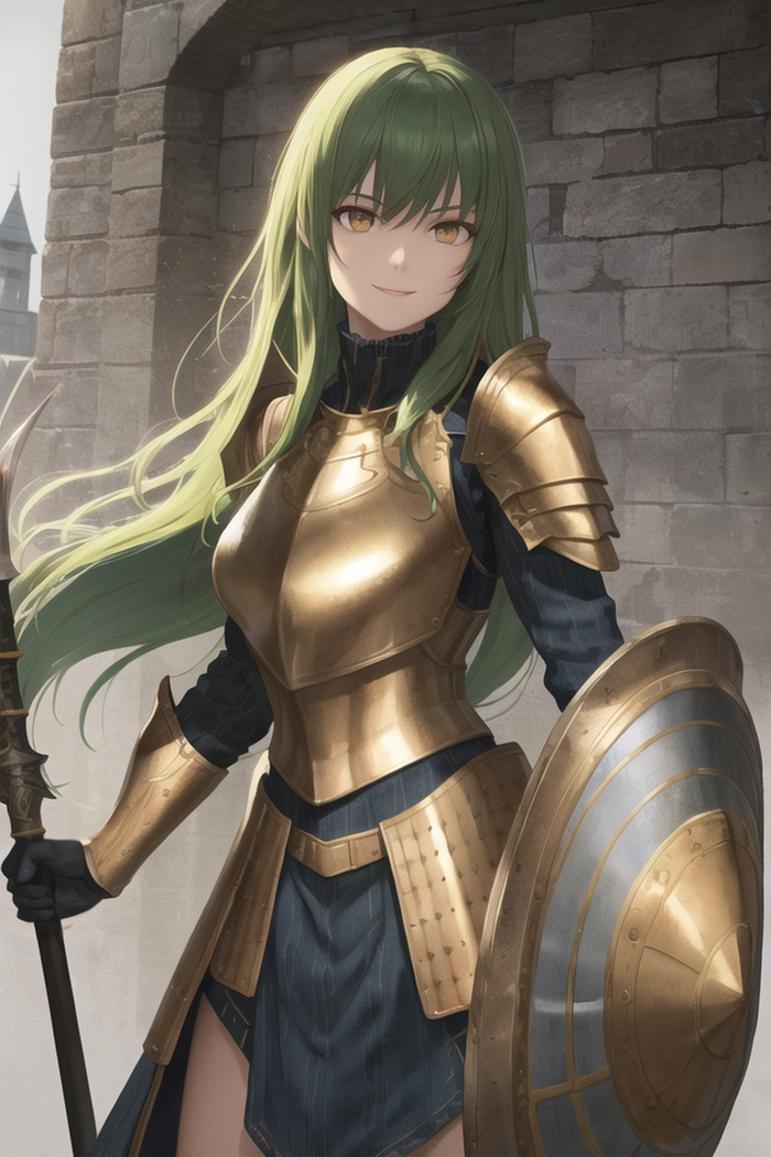 Pixiv. masterpiece, best quality, CG, wallpaper, HDR, high quality, high-definition, extremely detailed, lot of details, (intense shadows), (intense lighting), (detailed: 1.1), very detailed eyes, very detailed face, very detailed hair, very detailed background, 1girl, female, fullbody, fullplate armor, standing, town, shield, holding shield, spear, holding spear, long hair, medium breasts, green hair, golden eyes, smile, holding weapon, solo, Negative prompt: lowres, bad anatomy, bad hands, text, error, missing fingers, extra digit, fewer digits, cropped, worst quality, low quality, normal quality, jpeg artifacts, signature, watermark, username, blurry, extra fingers, Комментарии к посту на сайте Пикабу.