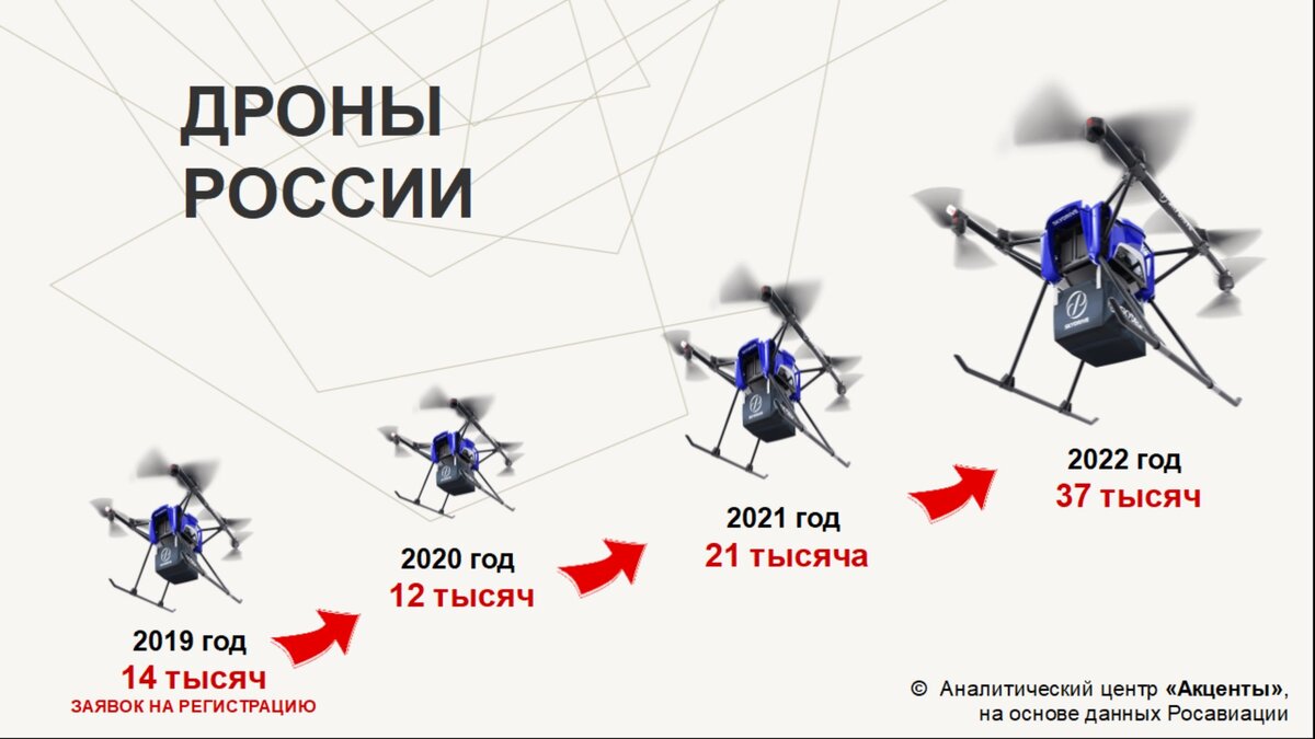 Над Россией летает больше 70 тысяч дронов - такие данные приводит Росавиация. Причем половину беспилотников поставили на учет лишь за 2022 год. Новых рекордов теперь ждать нескоро. Учитывает Росавиация, понятно, только гражданские дроны - и весом не более 30 килограммов. Причем не только выпущенные, но и импортированные в Россию. Дронов в России уже на порядок больше, чем всех самолетов и вертолетов вместе взятых - и гражданских, и военных. А беспилотная армада со свистом растет. Да так растет, что во многих регионах уже запретили запускать беспилотники. Частным лицам нельзя использовать дроны почти нигде от Крыма до Татарстана. Можно - только органам власти и предприятиям. Хотя им принадлежит лишь 15 тысяч дронов в России, 55 тысяч - у физлиц. Запрет уже ударил по российским производителям дронов - стало меньше заказов. Так что по итогам 2023 года, очевидно, Росавиация недосчитается целой беспилотной эскадрильи.