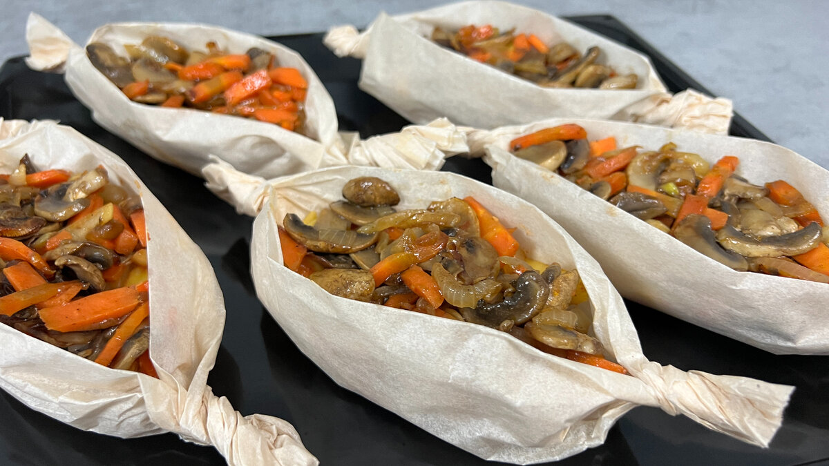 Сегодня готовлю необычное блюдо из шампиньонов и картофеля в духовке. Я их называю лодочки с грибами. По такому принципу их можно готовить с разнообразной начинкой не только из грибов и овощей, но из круп и бобовых. Чтобы блюдо при запекании оставалось сочным, готовлю лодочки в пергаментной бумаге (подходит и фольга). Блюдо получается сытным, вкусным и выглядят очень красиво. Как готовить: 500 грамм шампиньонов нарезаем пластинками. И выкладываем на разогретую сковороду без масла и готовим под крышкой. Как только шампиньоны пустят жидкость, крышку снять и готовить дальше без крышки до испарения жидкости. Луковицу нарезаем четверть кольцами. Добавляем немного растительного масла и жарим на среднем огне около 5 минут. Добавляем морковь нарезанную соломкой, перемешиваем. Солим, перчим и готовим еще на среднем огне около 5 минут. Добавляем кетчуп, перемешиваем и готовим еще пару минут. Картофель нарезаем брусочками. Добавляем соль, паприку и перемешиваем. Делаем лодочки из пергамента.