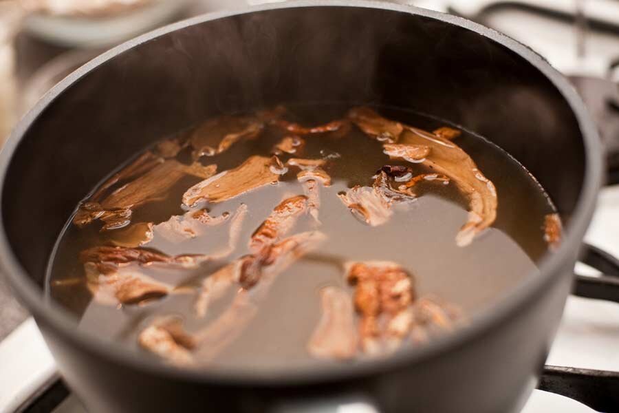 Сушеные грибы перебрать, промыть в теплой воде (30 - 35 градусов) несколько раз, после чего залить холодной водой (1,6 л воды на 40 гр сушеных грибов). Через 3-4 часа набухшие грибы варить в той же воде без соли до готовности . Вареные грибы вынут из бульона, промыть холодной водой мелко нарезать, нарубить или пропустить через мясорубку и использовать при изготовлении соуса. Бульон посолить и процедить. Грибной бульон из молодых грибов имеет светложелтый оттенок; из старых грибов бульон получается более темным. ~ Грибы сушеные 40 гр . Приятного аппетита . Подписывайтесь на канал дальше больше и интереснее.