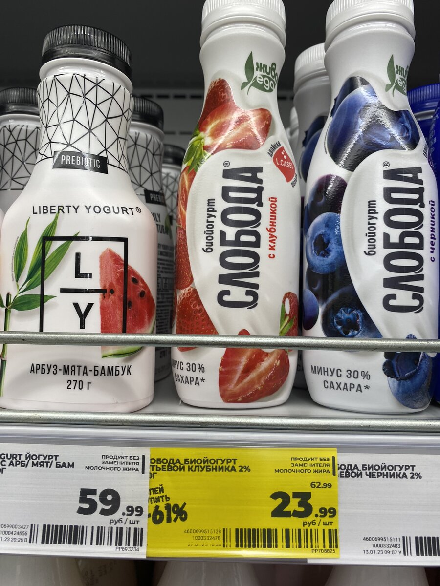 Всем привет! Всех с наступающими выходными. Выходные впереди, а у меня пустой холодильник. Решила зайти в Магнит по пути домой, немного пополнить запасы. Осталась в приятном шоке! Смогла некоторые товары купить с очень большой скидкой! Кое-что покажу вам, вдруг и у вас такое есть. Я, кстати, нахожусь в Московской области, город Раменское. Первое, что покажу, питьевые йогурты. Всегда беру что-то, либо снежок, либо питьевые йогурты - муж любит. Как вы знаете, йогурты сейчас вообще все дорогие. Средняя цена 50 рублей за бутылочку. А тут! Биойогурт Слобода. Клубничный. 23.99 рублей! Вот это удача! Взяла несколько штук! Срок годности до 2 февраля. Успеем выпить. Перевожу взгляд и вот это дааа! Фруате. Клубника-киви 14.99 рублей. Небольшой кувшинчик, с трубочкой. Но у этого йогурта правда срок годности до 29 января. Но сегодня только 27е, поэтому, если выпить сегодня-завтра, то вполне можно брать. Йогурты такие беру тоже иногда, они вкусные. Сметана Простоквашино. 10% 59.99 рублей. У нас С