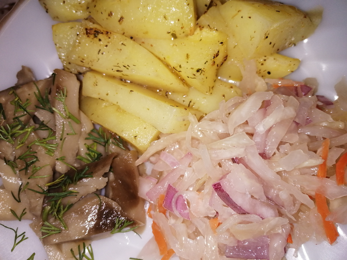 Картошечка получается нежная, рассыпчатая, невероятно вкусная. Здравствуйте, друзья! Меня зовут Светлана, и я рада приветствовать вас на своём кулинарном канале. Я публикую простые и доступные рецепты. Читайте, комментируйте и готовьте вместе со мной. Подписывайтесь, чтобы не пропустить мои следующие рецепты. Картошка с солёными грибами и квашеной капустой с лучком - самое подходящее блюдо для тех, кто держит пост. Ингредиенты: 1 кг картофеля 2 ст. ложки растительного масла 1/2 ч. ложки соли по вкусу специи, любимые пряности Как приготовить. Взять примерно равные по размеру клубни картофеля, почистить и разрезать каждую картофелину на 6 - 8 частей. Переложить картофель в ёмкость, которую можно использовать в микроволновой печи. Это может быть пластиковый контейнер, стеклянная форма для выпечки или что-то другое. У меня глубокая тарелка для салатов. Картошку посолить, добавить по вкусу и желанию приправы и специи (чаще все