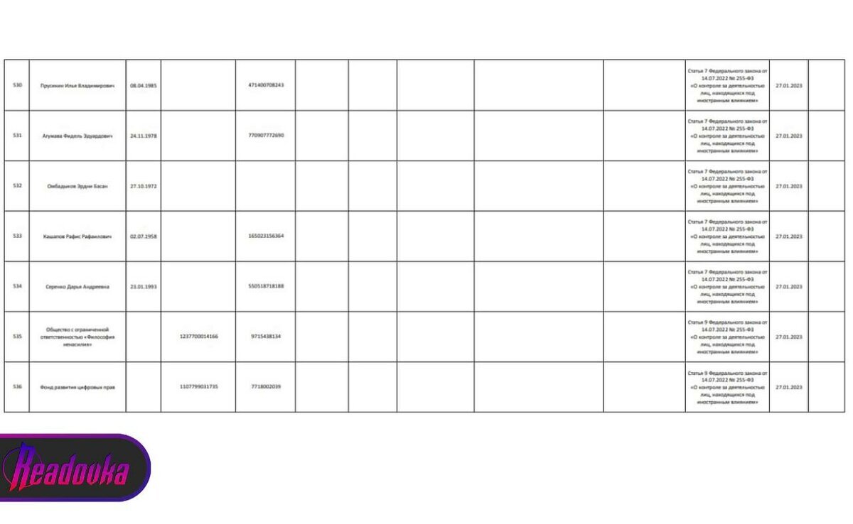 Также список пополнило ООО «Философия ненасилия». Минюст РФ пополнил список иностранных агентов. В него попали общество с ограниченной ответственностью «Философия ненасилия» и Фонд развития цифровых прав. Кроме двух юридических лиц физлицами-иноагентами признаны: журналист Агумава Фидель; официальный представитель Далай-ламы XIV в России Омбадыков Эрдни Басан; правозащитник Кашапов Рафис: представительница «Феминистического антивоенного движения» (признано Минюстом иноагентом в РФ) Серенко Дарья Андреевна. Самым ожидаемым персонажем в списке стал солист группы Little Big Илья Прусикин. Ранее Readovka сообщала, что Минюст РФ включил в реестр иноагентов певицу «Монеточку».