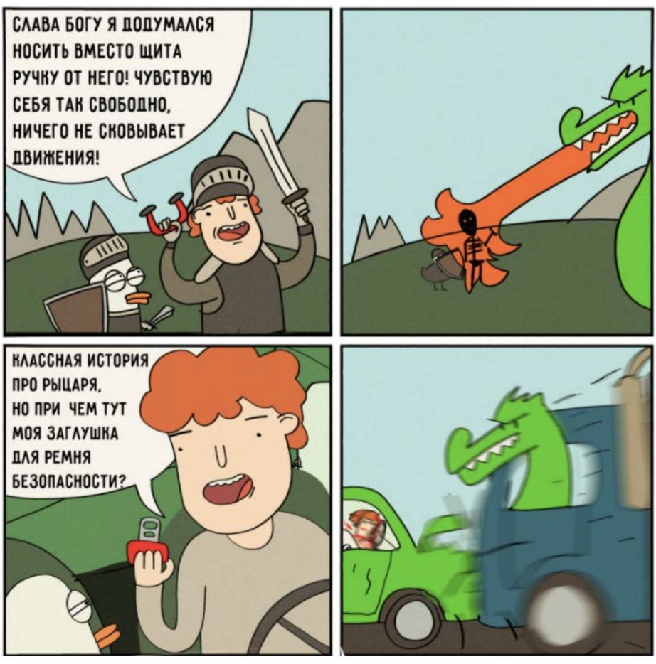 Лучше всего объяснять на примерах. Избегая умных слов и терминов. А иногда даже цифр. Наша задача — развернуть клубок «сложности» в простые и наглядные картинки. Ниже комикс, который нарисовал мой товарищ — Илья Горюч. Он красочно объясняет, почему лучше не использовать «заглушку» для ремня безопасности. Позже я сделал из этого комикса гиф-анимацию... Через пару дней после создания, «гифку» с комиксом распространил ресурс «Пикабу» и украл паблик «Лепра». Суммарно она набрала больше 400 000 просмотров. Во многом благодаря яркому примеру (с юмором) и популярности моего друга иллюстратора. Это одна из самых известных его работ. Я выбрал её не случайно. Я знал, что хорошо работают польза, юмор и примеры. Кроме того, эта работа и так была в «топах» по просмотрам его блога. Итак, если вам позволит ваша гордыня, возьмите уже известного блогера, ютубера или иллюстратора и предложите сделать для него мультфильм (гифку, комикс) бесплатно. Если ему понравится ваша работа, он обязательно сошлется