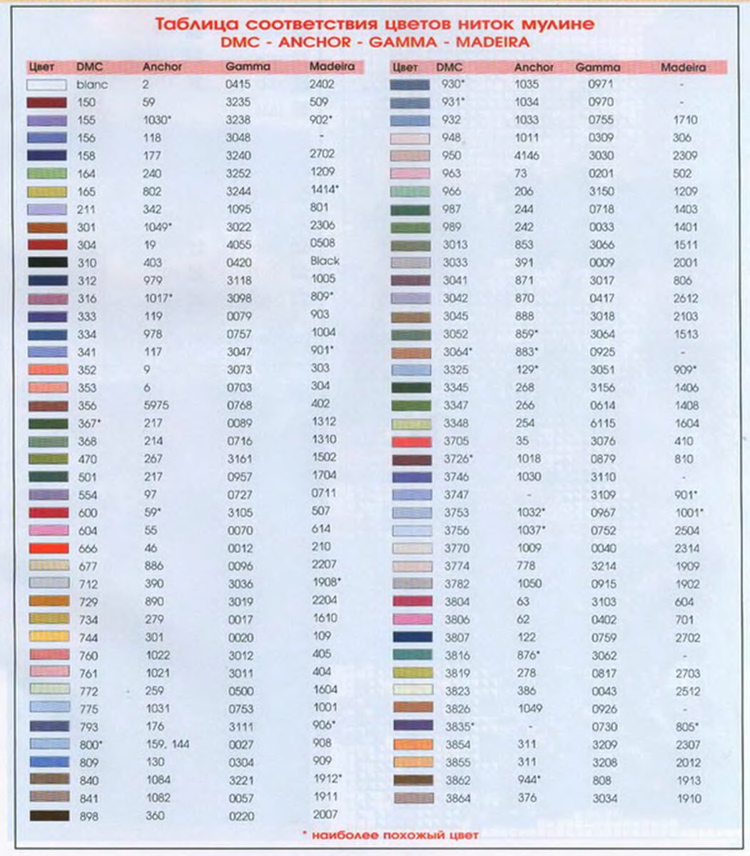 Таблица соответствия цветов ниток мулине.