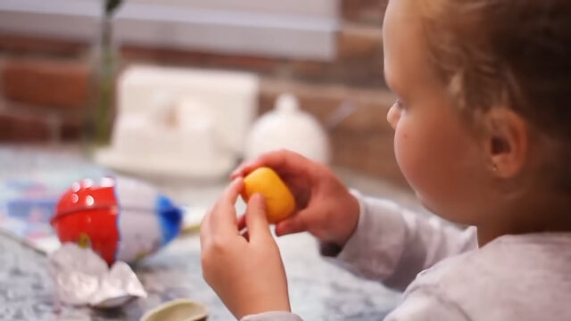 В форме же все равно остается достаточное количество, чтобы образовалась привычная для нас шоколадная скорлупа, далее формы отправляются в следующий цех, где наполняются вторым слоем, то есть белым шоколадом, все это потом отправляется в накопитель, где застывает в течение нескольких минут, теперь очередь яичного желтка, то есть капсулы с игрушкой, ее помещают в одной из половинок, затем голубая и розовая форма соединяются и простукиваются.