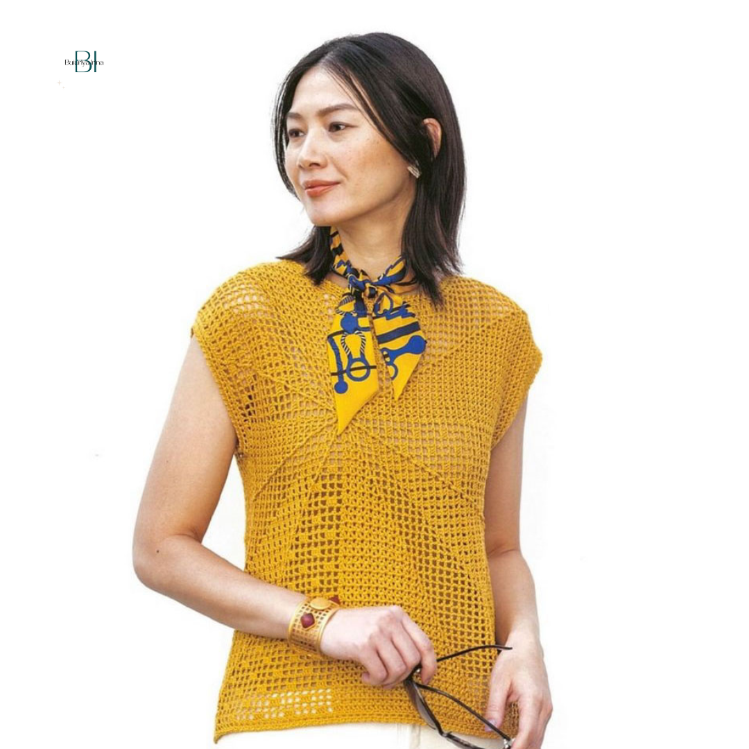 Изысканные и оригинальные модели японских журналов по вязанию поражают и восхищают одновременно. Мне они нравятся тем, что схемы есть на всё изделие. Не надо вязать образцы для убавок и прибавок. Все есть в схемах. Надо только рассчитать плотность под свою пряжу и номер крючка и вязать. На вкус и цвет товарищей нет. Это понятно. И свою точку зрения я навязывать никому не буду. Просто буду делиться теми моделями, которые понравились мне. Многие модели можно взять просто за базу, и на их основе связать свое авторское изделие. Футболка Выкройки и схемы: Есть схема для вывязывания скоса плеча и горловины. Осталось только связать рукава и легкий джемпер на весну-лето готов. Лен, хлопок, вискоза - состав пряжи может быть любым. Вязать желательно крючком N1,5-3. И не забывает делать расчеты для своей плотности вязания. Топ В журнале на модели топ смотрится мешковато. Но из-за этого не надо ставить крест на узоре. Ведь на схеме есть то, что надо для базы: убавки и прибавки по пройме и выре