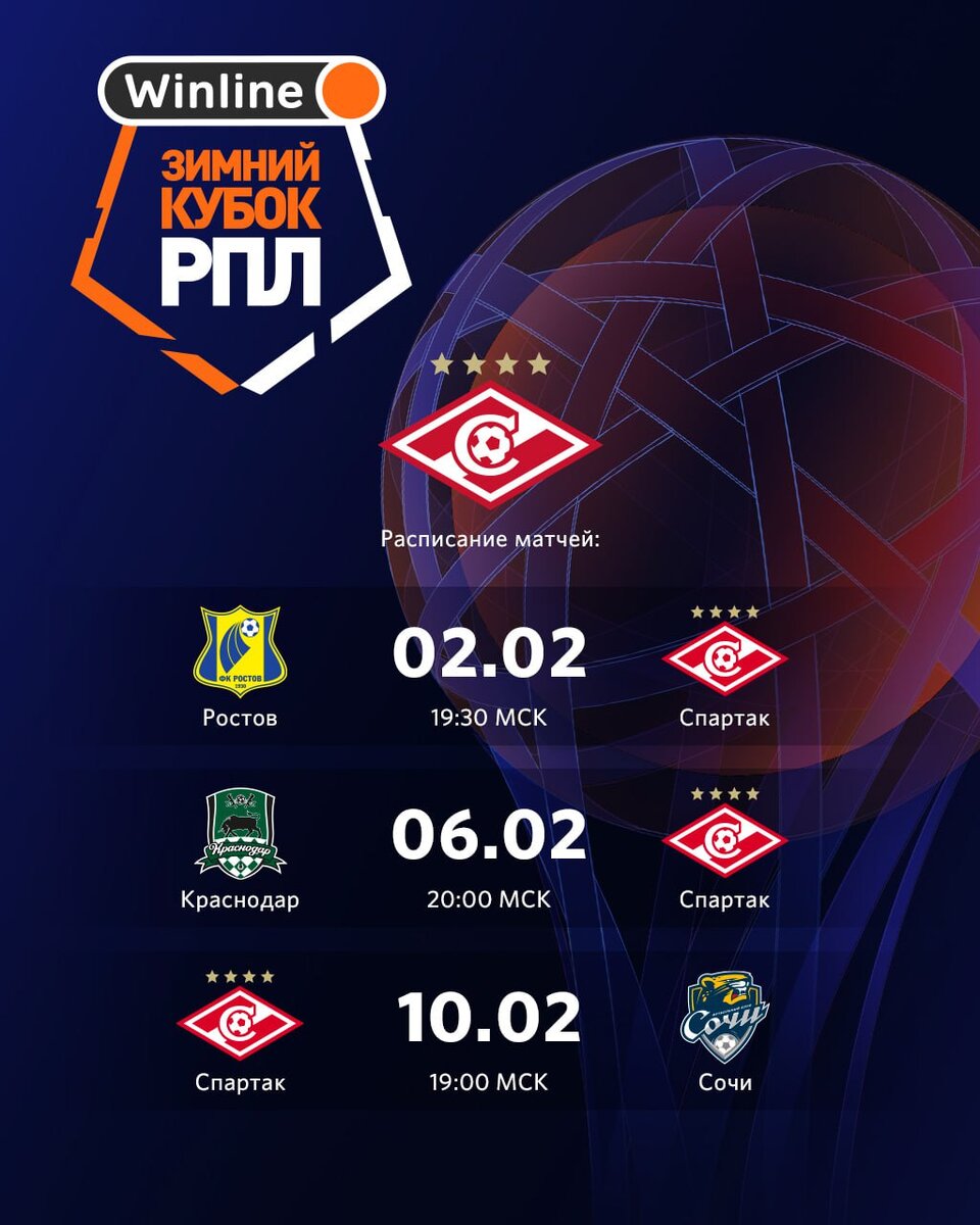 Всем привет, подписчики и гости моего канала! Хотелось бы поблагодарить всех, кто читает мой канал, ставит лайки и иногда пишет комментарии! В начале зимней паузы у меня пропал актив, приходило 1-2 рубля в день, но доход вырос, всё отлично! Всем спасибо! Теперь к делу. Зимний кубок РПЛ пройдёт 2-11 февраля в Абу-Даби! Участвуют команды "Спартак", "Ростов" "Краснодар", "Сочи"! Вот расписание всех матчей 👇 Расписание 2 февраля, 19:30, «Ростов» – «Спартак»; 3 февраля, 19:30, «Краснодар» – «Сочи»; 6 февраля, 17:00, «Сочи» – «Ростов»; 6 февраля, 20:00, «Краснодар» – «Спартак»; 10 февраля, 19:00, «Спартак» – «Сочи»; 11 февраля, 20:00, «Ростов» – «Краснодар» Судьи Судить матчи "Спартака" будут Павел Кукуян, Кирилл Левников и Владислав Безбородов Обязательно для просмотра! Этот кубок будет очень интересный, так как мы все знаем наших соперников, так как нам с ними ещё играть, и в конце концов, очень уж хочется посмотреть на игру команды Абаскаля после зимней паузы! Какие будут изменени
