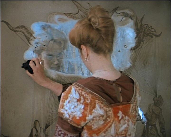 Столько эмоциональных переживаний в одном моменте этого фильма, что я подумала, что его стоит пересмотреть только именно из-за него. Наверное, теперь, это мой любимый кадр, и уже не первая статья про "Обыкновенное чудо", хотя в самом этом чуде, - о том что любовь творит чудеса и любимый в медведя не превращается, фильм меня не убедил. Хотя там есть и искромётные шутки-не шутки, а высказывания с грустью от того, что в них вся суть (об остросоциальном), - это я про реплики Евгения Леонова. Да, и вся нежность принцессы чего стоит с тяжёлой завораживающей песней... Нелепо, смешно, безрассудно, безумно, волшебно. Ни толку, ни проку, ни в лад, ни впопад совершенно. Вот, этот кадр, когда любимая (или не очень) волшебника стирает дракона с зеркала, чтобы мы хотя бы раз посмотрели на себя, что стоит за нашей душой, за зеркалом души... А в глазах, - разбитая иллюзия, обманутые надежды, и как результат ненависть. А потом, в конце... Да, гори оно всё синим пламенем... И то чувство, что волшебник-