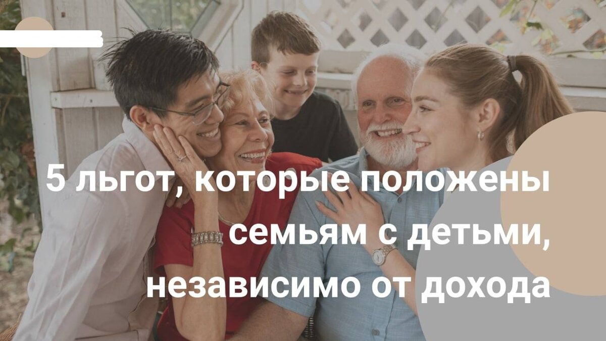 Многие семьи могут получить льготы, независимо от того, какой у них доход и размер имущества. Освобождение от земельного налога. Положено многодетным семьям. Налогом облагается площадь за вычетом 6 соток. Льготу можно получить для одного участка. Бесплатные лекарства. Положены всем детям до 3 лет, до 6 лет из многодетных семей и до 18 лет с инвалидностью. Лекарства можно получить в льготной аптеке по назначению врача. Отпуск в удобное время. Если в семье трое и более детей до 18 лет и младшему нет 14, то родители могут уйти в отпуск в любое удобное для себя время. Бесплатное горячее питание в школе. Предоставляется всем ученикам в начальной школе бесплатно, независимо от льготной категории. Вычет по налогу на имущество. Многодетные семьи с детьми до 18 лет могут получить вычет по налогу на имущество. Из площади квартиры дополнительно вычитается по 5 кв.м, для дома — 7 кв.м. на каждого ребенка. Налог начисляется только на остаток.
