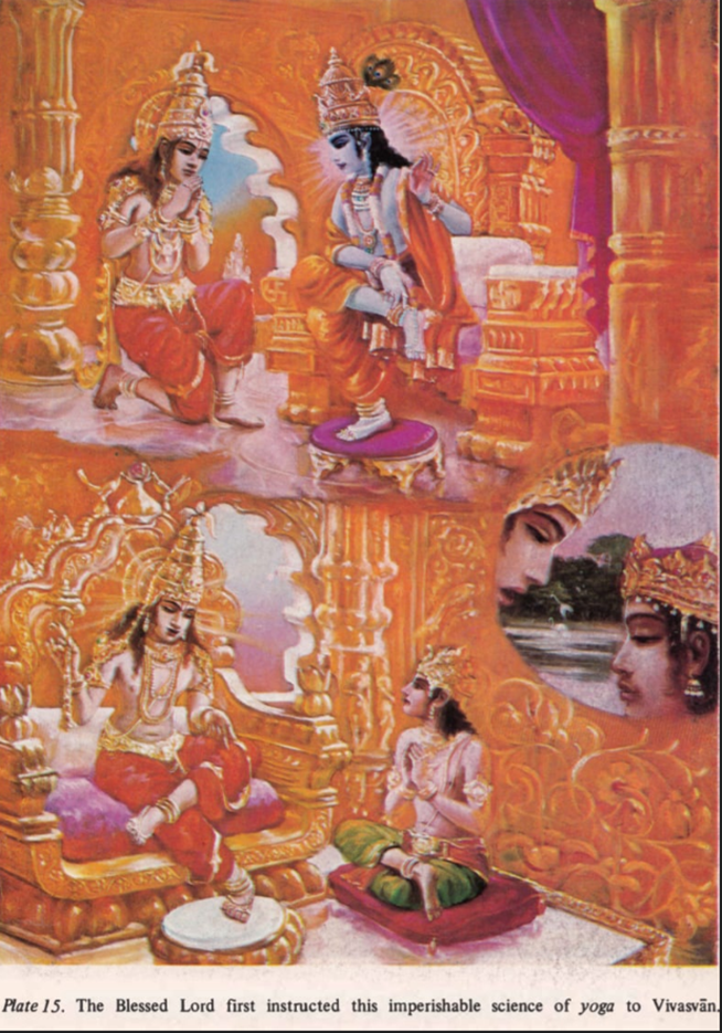 4.1: Всеблагой Господь сказал: «Я обучил этой нетленной науке йоги бога Солнца, Вивасвана; Вивасван обучил ей Ману, отца человечества; а Ману, в свою очередь, обучил Икшваку.