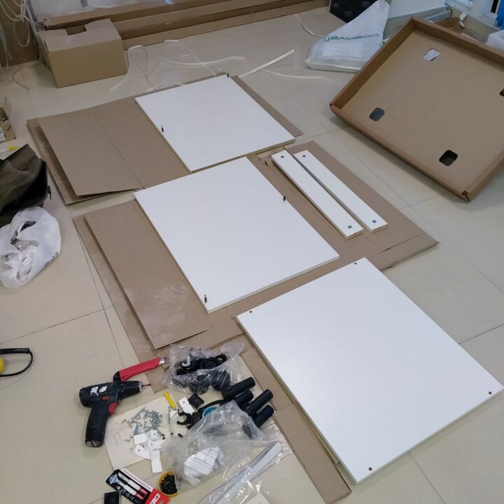 Попросили собрать шкафчики, установить столешницы и врезать мойки из камня. Без установки смесителей и подключения воды.