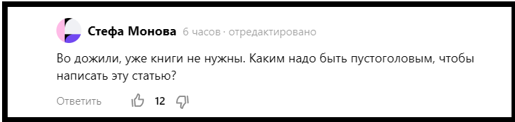 В последнее время меня очень интересует процесс расхламления и дзен с удовольствием подкидывает много статей разных авторов на эту тему. Я читаю не только статьи ,но и комментарии к ним. Обожаю комментарии, порой из них можно почерпнуть намного больше полезного,чем из самой статьи. Вот под одной из статей о расхламлении, где автор советовала выбрасывать из дома все не нужное в том числе и книги я наткнулась на этот комментарий. Не знаю почему, но люди если их мнение не совпадает с мнением другого человека сразу пытаются наброситься, оскорбить и обвинить человека в том, что у него отсутствуют умственные способности? Почему-то только свое мнение они считают самым правильным и не допускают других вариантов? Вот мне например книги тоже не нужны. Книги для меня из такой-же категории, как ковры и посуда за стеклом в серванте. Я не вижу смысла их нахождения в моем доме в большом количестве. Муж и дочь у меня очень много читают и книги именно в бумажном варианте, электронная у нас не пр