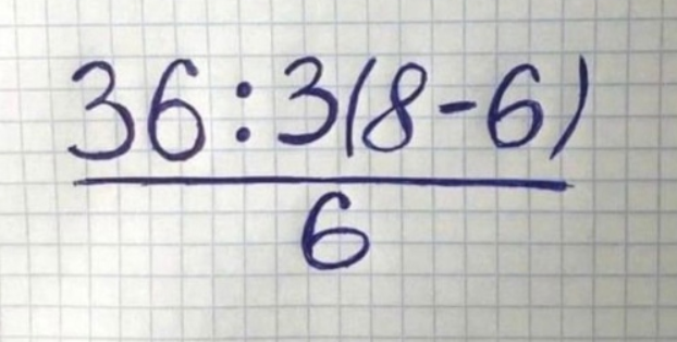 Итак, друзья, разберем задание с порядком действий, недавно нашумевшее в сети. Можно сказать, что люди делятся на два типа — те, у кого получилось 1 и те, у кого получилось 4. Так где же правда? Смотрим на порядок действий. Сначала — действие в скобках. А потом — ВНИМАНИЕ — выполняем в том порядке, в котором они записаны, так как других скобок нет. Для удобства восприятия поставила точку (знак умножения) между числом 3 и скобками. Запишем результаты действий: 1 действие: 8 – 6 = 2. 2 действие: 36 : 3 = 12 3 действие: 12 · 2 = 24 4 действие: 24 : 6 = 4 Ответ: 4. А те, кого получается 1, просто выполняют сначала умножение, а потом деление, что не обосновано правилами математики. Но я понимаю, откуда такое желание, скобки как будто прилипают к числу 3. Так и хочется умножить. Не забудьте поставить лайк. Подписывайтесь на канал!