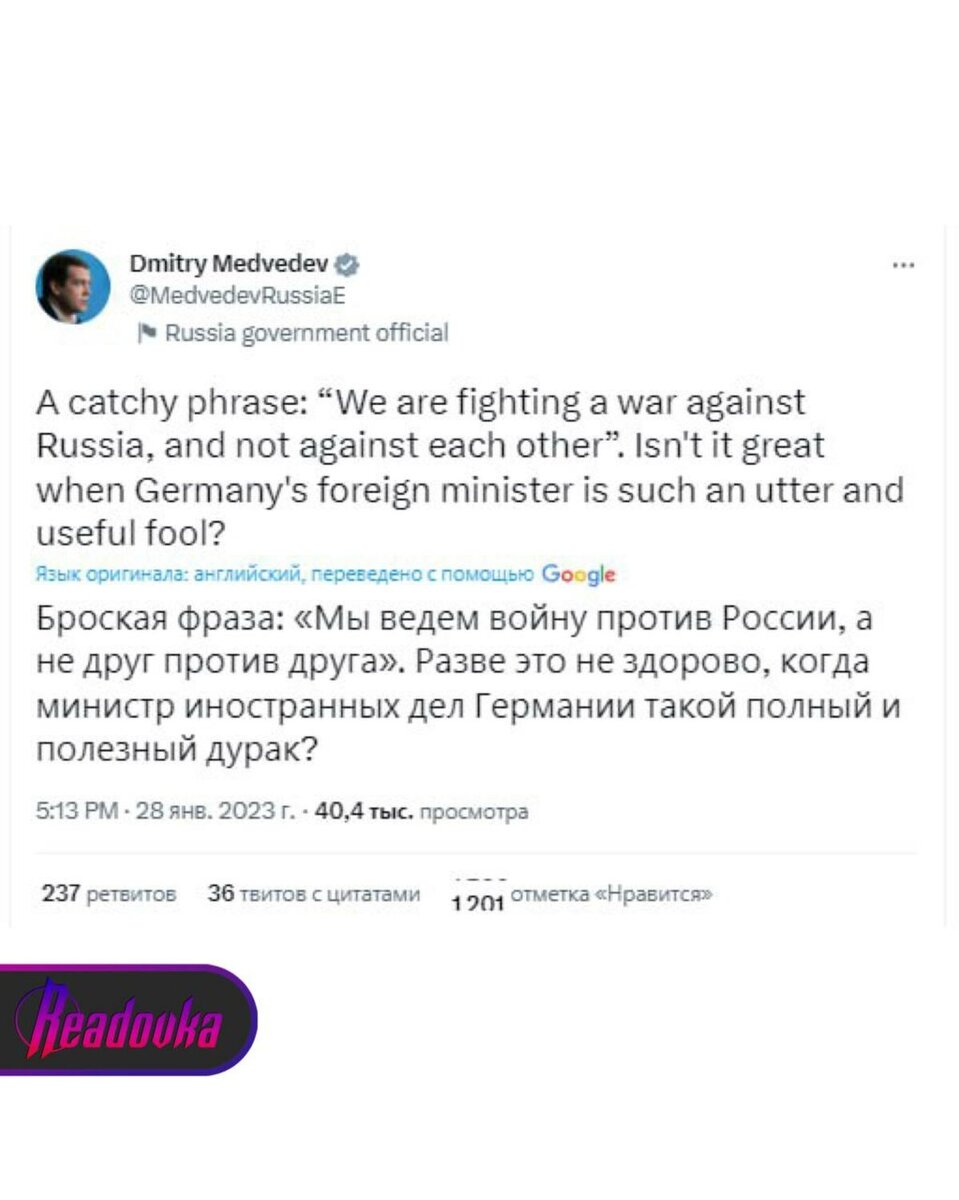 «Полная и полезная дура». Зампред Совбеза РФ Дмитрий Медведев не оставил без внимания броскую фразу главы МИД Германии Аналлены Бербок о том, что страны Евросоюза ведут войну против России, а не против друг друга. Комментируя ее признание в эскалации конфликта, которой занимается Германия и ее союзники, Медведев нелестно высказался об умственных способностях немецкого министра. «Разве это не здорово, когда министр иностранных дел Германии такая полная и полезная дура?», – написал Медведев в Twitter. Зампред Совбеза сегодня также разъяснил всем европейским министрам, какие на самом деле последствия будут у Третьей Мировой войны, которую так активно пытаются развязать с Россией страны Евросоюза и НАТО. Кроме того, Медведев заметил, что в первую очередь при глобальном конфликте пострадает именно «старушка Европа». Ранее Readovka писала о том, что Медведев раскрыл психологические проблемы Владимира Зеленского.