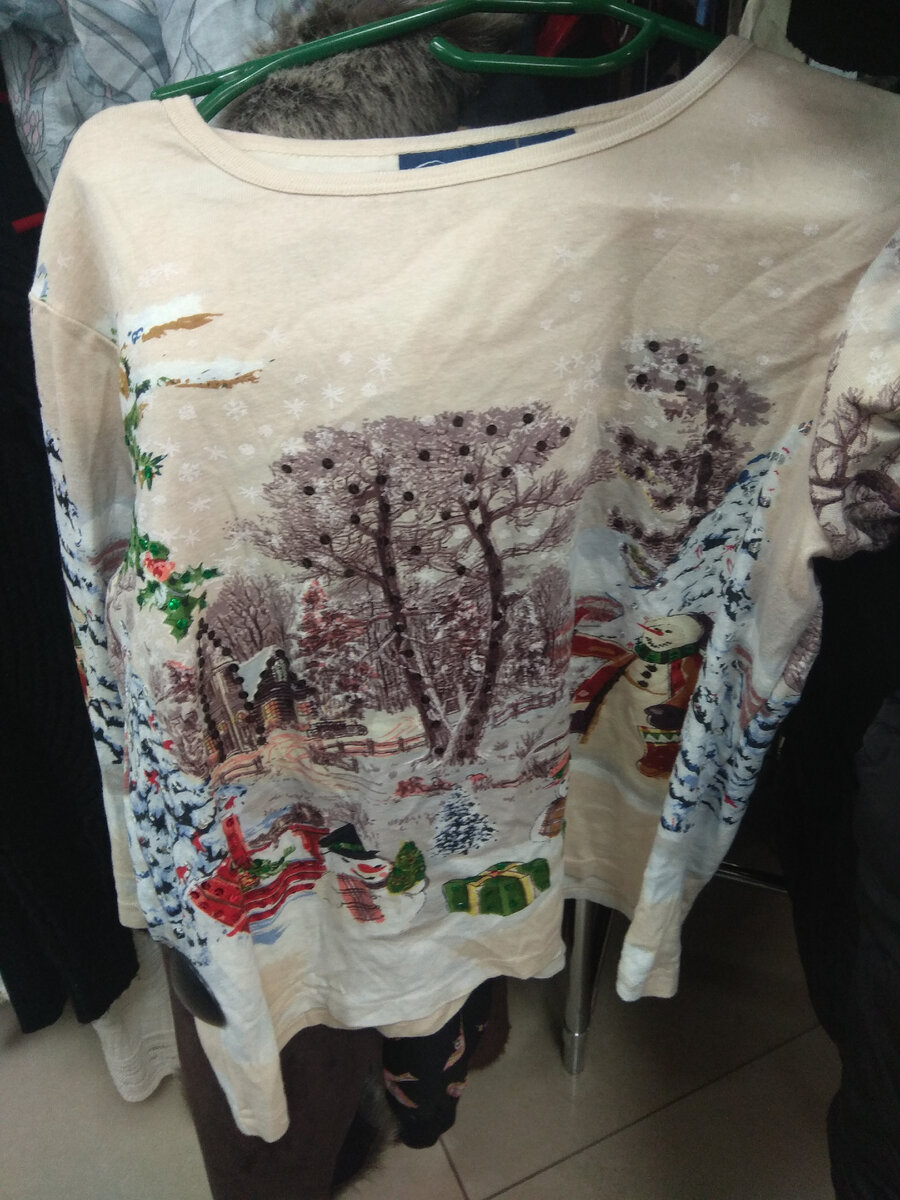 Посещение секондов это своего рода охота — никогда не знаешь, что попадётся и попадётся ли вообще) Свитшоты из хлопка. Прямо-таки новогодний пейзаж, расшитый пайетками: Тоненький, приятный трикотаж. Хлопок, Индия. Зимой замёрзнешь в таком, а летом не по сезону. Купит ли его кто? Искусственное освещение делает своё дело — чисто черный цвет превратился в серый. Машинная вышивка, приклеенные стразы и немного бусин — новогодние поющие птицы. На вид старомодная кофта. Но какая-то чересчур добротная. Аккуратная вышивка, даже бирка с указанием бренда очень интересно оформлена. Дома уже поискала информацию о бренде "Faithful & True Mantaray" — довольно дорогой, возможно поэтому и качественная одежда, точнее наоборот: сначало качество, потом цена) Из минусов — носили кофту активно. Из плюсов — симпатичные деревянные пуговички. Ну не покупать же ради пуговиц) Кружевные кофточки. Мне кажется, что подобные были и в пору моей молодости, и когда моя мама была молодая. Или они не выходят из моды и
