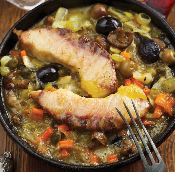 Приготовляется из той рыбы, которая бывает в остатке, как из рыбы сваренной, так и рыбы соленой, как-то: тёшки малосольной или свежей, лососины, судаков, сигов и проч., следующим способом. Вначале взять в кастрюлю шинкованной капусты, налить кипящею водою и сварить до мягкости; потом запасеровать на прованском масле одну мелко изшинкованную луковицу; когда лук начнет желтеть – положить ложку муки, развести постным бульоном (какой есть) и выкипятить соус до густоты. Потом выбрать из воды на сито сваренную капусту, отжать немного воду, положить в соус, размешать и вскипятить. Между тем приготовить 4 сваренные или маринованные гриба, 2 очищенные огурца, ½ фунта (200г) малосольной тешки и ½ ф. свежей лососины, которую изрезать в ломтики и поджарить на масле. Положить на сковородку (сковородка для солянки употребляется без ручки и луженая) ряд капусты, сверх капусты положить ломтики грибов, огурцов, тешки и лососины, покрыть снова капустою; наложить грибов и проч., и продолжа
