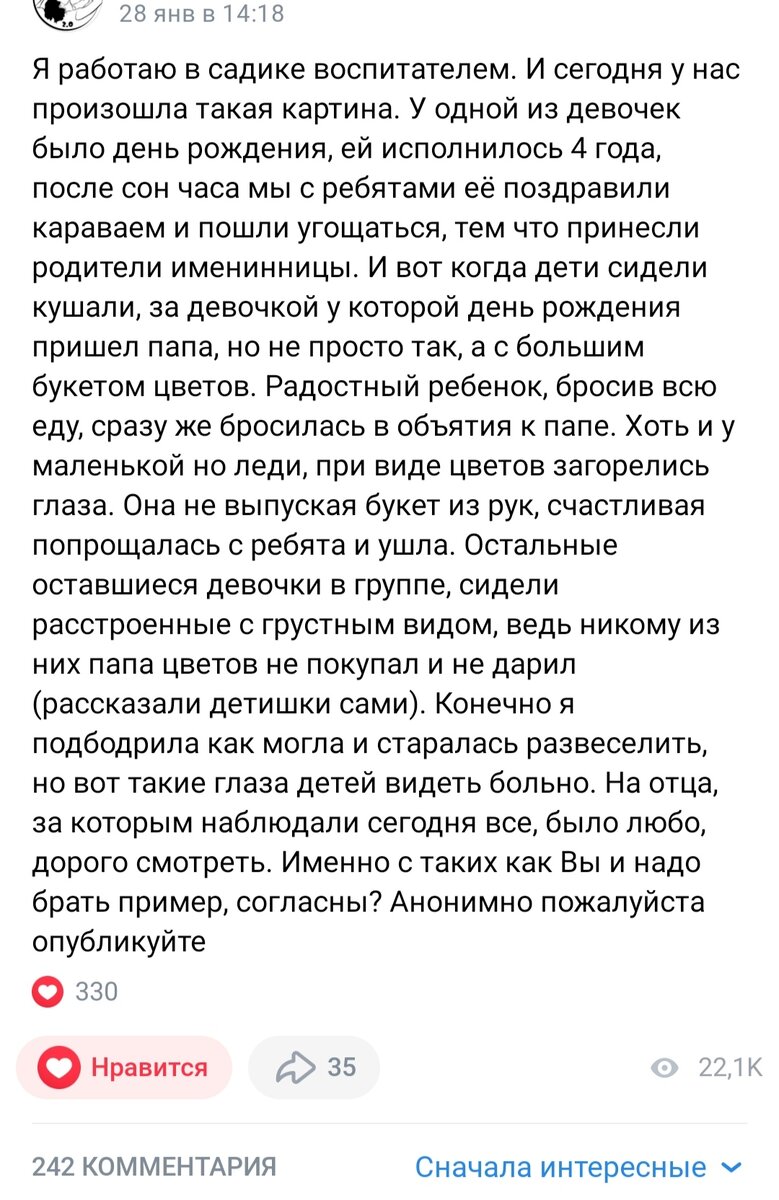 Приветствую вас уважаемые подписчики и гости канала! 🙋♀️ Совсем недавно, в нашей мамской группе увидела анонимный пост, который вызвал шквал комментариев, конечно же мнения разделились на два лагеря. Да что уж там, даже у нас с супругом мнения не сошлись. 😂 Чтобы вы не думали, что я выдумала историю сама, вот реальный пост. 😉 Конечно, многие поддержали мнение, в том числе и мой супруг, что нужно придерживаться фразы "счастье любит тишину". Эта очень тонкая грань. Вроде бы ничего такого, где хочет, там и дарит своему ребёнку подарок. А с другой стороны всё таки это детки и детки маленькие. И не у каждой девочки и мальчика есть папа! Поэтому, уважая чувства и эмоции других детей подарки всё же лучше дарить дома. Вот что думает большинство людей. По такой логике, тогда и праздники в честь пап и мам, тоже следует отменить, ведь не у всех полноценная семья. Это тоже может послужить травмой и расстройством ребёнка... Но ведь никто не запрещает другим папам вести себя по мужски, ведь