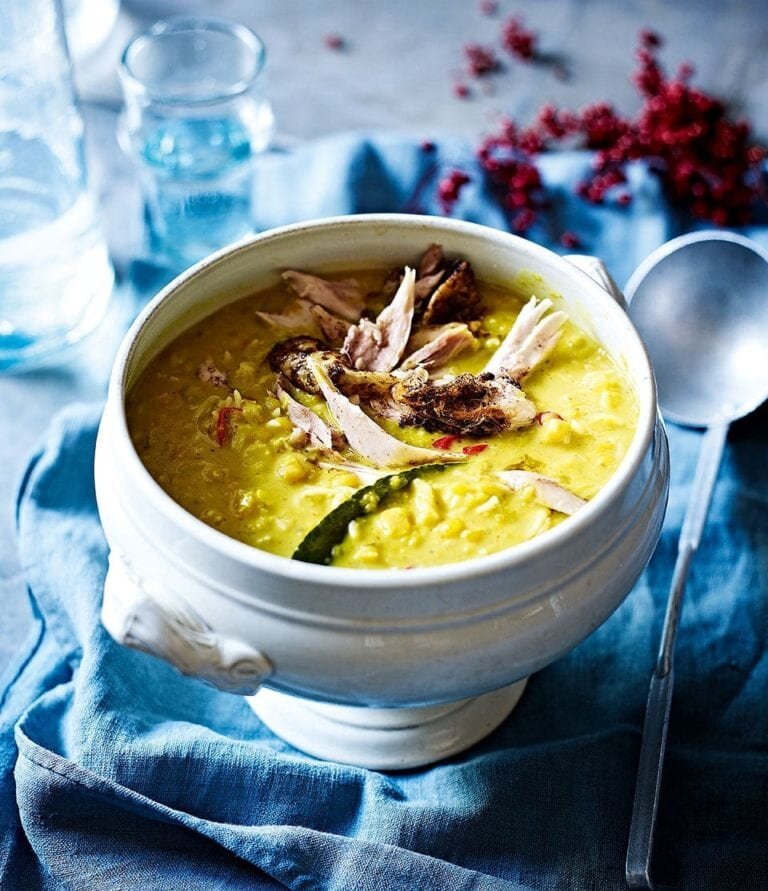 - Разогрейте арахисовое масло в большой тяжелой сковороде, затем слегка обжарьте лук и чеснок в течение 10 минут или до размягчения. Добавьте чили и все молотые специи. Добавьте лавровые листья, чечевицу и дробленый горох, затем добавьте бульон. Доведите до кипения, затем убавьте огонь и варите 30 минут или до размягчения чечевицы. Влейте кокосовое молоко и варите 5 минут, затем добавьте рис.