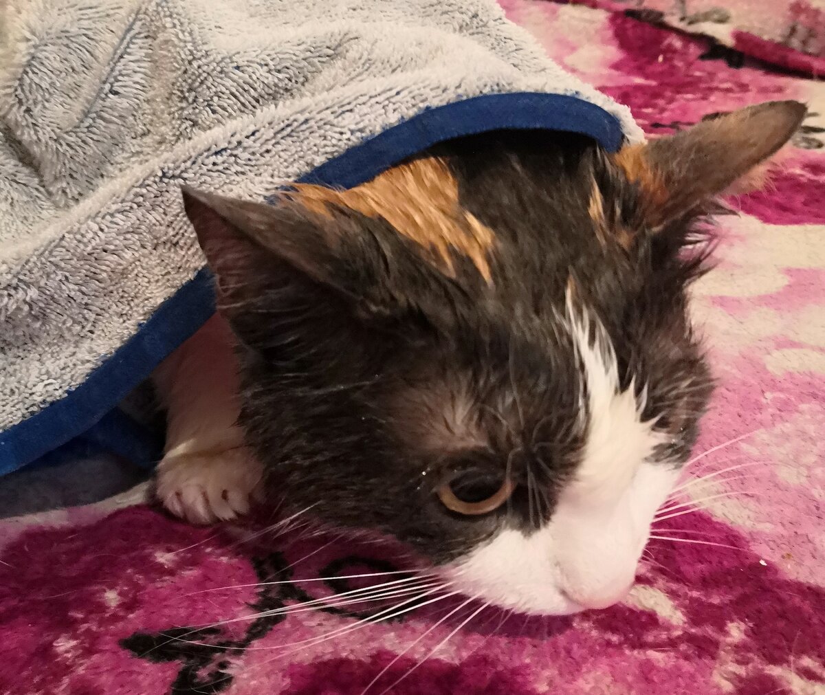 Прошлой осенью мы приехали с дачи, привезли с собой овощи, фрукты, ягоды, и я позвала подругу, чтобы угостить её "дарами природы". Когда Света пришла, я как раз собиралась мыть кошку, чтобы смыть с неё деревенскую пыль (её тоже брали с собой на дачу). Наблюдая приготовления к мытью и слыша моё бормотание о том, что Мариса опять будет вырываться и царапаться, так как не любит мыться, Света предложила свою помощь, чему я очень обрадовалась и с радостью доверила ей мытьё кошки. С чего она начала: набрала тёплую (40 градусов) воду в два тазика, один для мыльной воды, второй- для чистой. Постелила на дно тазиков по полотенцу, чтобы лапы кошки не скользили по дну таза. Открыла специальный зоошампунь для кошек и поставила рядом, под рукой. Положила рядом ковшик для воды. Приготовила большое полотенце, в которое заворачивать кошку. И попросила дать какую-нибудь вкусняшку для кошки. Когда всё было готово, Света угостила Марису вкусняшкой. Затем взяла её на руки, и, гладя кошку и разговаривая