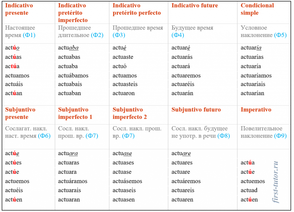 Взаимосвязь времен в испанском языке на примере глагола actuar Примеры Desde que llegó actúo como una persona diferente. — С тех пор, как оно приехала, я веду себя как совершенно другой человек. Si no actúo, los perderé para siempre. — Если я не начну действовать, то я потеряю их навсегда. Примеры El Consejo de Seguridad no actuaba en el contexto de la responsabilidad del Estado y no imponía sanciones o penas. — Совет Безопасности не действовал на основе ответственности государств и не вводил санкции или наказания. Todos decían que actuabas raro. — Они все говорили, что ты вел себя странно. Примеры Entonces dice que Durant actuó por su propia iniciativa. — Так вы говорите, что Дюран действовала по своей инициативе. Примеры La delegación de la República de Macedonia actuará en dicho sentido. — Делегация Республики Македонии будет действовать в этом направлении. Примеры La seguridad de mi padre jamás actuaría así. — Охранники моего отца, никогда бы так не поступили. Примеры No puedo c