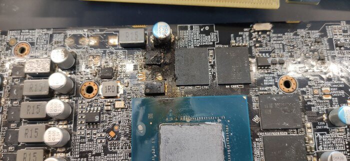 На ремонт зашла партия карт. В ряде которых было два гигабайта. Из одной пошёл дым во время работы, даже видео есть, как выходит джин: А, как мы все знаем, без магического газа внутри - видеокарта не будет работать, следовательно, её надо чинить. Клиент отказался восстанавливать доску, поэтому перекинул гпу на другую карту, где он был неисправен. Но мы все же ГОРИМ желанием восстановить эту доску, которую выкупили на запчасти) Чтож, самая обычная gigabyte rtx 3070 gaming oc, горела хорошо, качественно. Придётся пилить. Снимаем память, чтобы не мешалась и не замкнула чего: Прогар с этой стороны зачищен, но помимо обвязки этой фазы здесь шел 12в полигон, питающий шим pcie, его тоже необходимо будет прокинуть. Ух, красота) Восстановим необходимый полигон. Ставим на место новый гпу и память: Проверяем видеокарту на выдачу изображения и получаем посткод д6: Вполне логично - родной чип на карте был не лхр версии, а тот, что мы поставили новым уже лхр, 2022 года. Поэтому при вычитке с биоса м