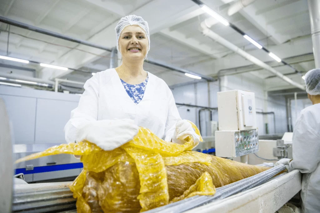 Стоит отметить, что на производстве карамели работают исключительно женщины, мужчин здесь можно встретить только в качестве наладчиков станков. Температура карамельной массы, с которой работают, достигает 100 градусов, а когда происходят неполадки на линии, женщинам и вовсе приходится нелегко — липкую массу весом до 150 кг достают из вакуумного аппарата и проминают вручную.