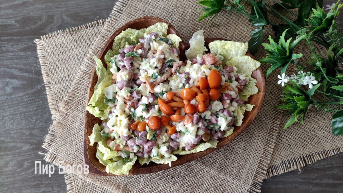 Сегодня у нас сытный и вкусный салат. Готовится он из простых продуктов и за считанные минуты. Хорошо подойдет для спокойного ужина и для праздничного стола. *** Подробный рецепт можно увидеть в видео на моем канале здесь или на канале YouTube Пир Богов вот здесь 🥘🧆🥗. Еще там есть много вкусных рецептов. 🥧🍹Подписывайтесь))) 😉 🤗А это мы в VK: https://vk.com/pir.bogov А еще мы в Telegram: https://t.me/PirBogov *** Состав: Способ приготовления: Зеленый лук и петрушку промыть прохладной водой, обсушить и нарезать. Все ингредиенты выкладываем в салатник или миску для смешивания. Листья пекинской капусты или салата нарезаем или рвем руками. Небольшое количество откладываем для оформления. Вареные яйца нарезаем средними кусочками. Фасоль промываем прохладной водой и выкладываем в чашу. Маринованные опята по желанию промываем водой. Небольшое количество оставляем для оформления, а большую часть отправляем в салат. Перчим и солим. Добавляем немного майонеза и все хорошо перемешиваем. В б