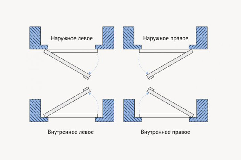 Чтобы общаться на одном языке с продавцами дверей, фурнитуры, а также установщиками дверей и дизайнерами, стоит запомнить, как определять открывание двери: «левое», или «правое». По российским правилам Левая дверь внешнего открывания Подойдите к двери со стороны лестничной площадки (улицы). Если дверная ручка расположена на правом краю полотна, дверные петли находятся с левой стороны двери, и вы открываете её левой рукой, двигая на себя, то такая дверь считается левой. Левая дверь внутреннего открывания Подойдите к двери со стороны квартиры. Если дверная ручка расположена справа, а дверные петли находятся слева от двери, и вы открываете левой рукой, двигая ее на себя, то такая дверь считается левой. Правая дверь внешнего открывания Подойдите к двери со стороны лестничной площадки (улицы). Если дверная ручка расположена на левом краю дверного полотна, а дверные петли находятся с правой стороны двери, и вы дверь открываете правой рукой, двигая ее на себя, то такая дверь считается