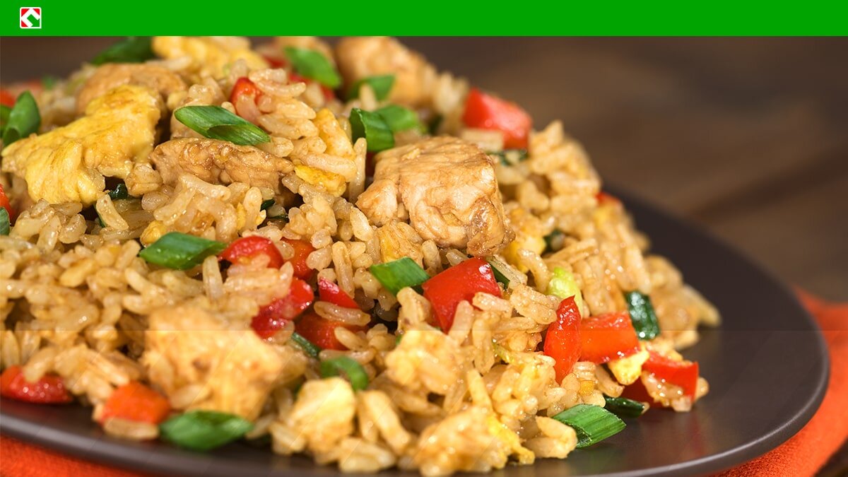 Лук и морковь мелко нарезаем и обжариваем на растительном масле до золотистой корочки. Добавляем зеленый горошек, специи и тушим еще несколько минут. Затем сдвигаем на одну сторону сковороды, освободив другую. Яйца взбиваем и выливаем на освободившуюся сторону, доводим до готовности, постоянно перемешивая. Затем смешиваем вместе с овощами. Рис отвариваем до готовности и высыпаем в сковороду с овощами. Добавляем оливковое масло, мелко порезанный зеленый лук и хорошо перемешиваем. Тушим несколько минут и выключаем.