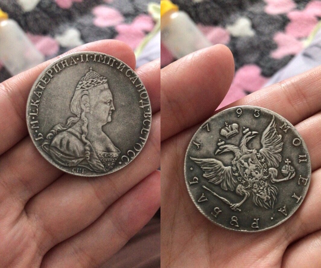 На этом фото подписчик прислал рубль 1793 года, Санкт-Петербургского монетного двора, так еще и без инициалов минцмейстера, в густой патине.