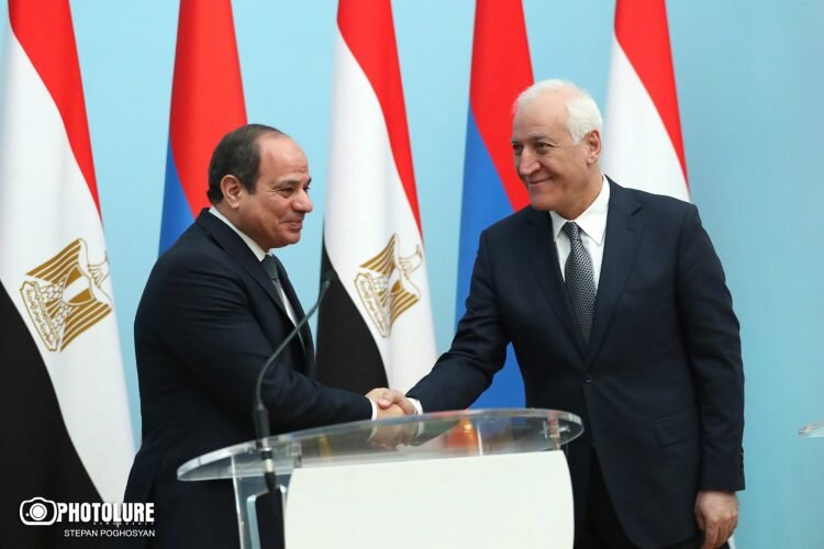Президенты Армении и Египта Ваагн Хачатурян и Абдель Фаттах ас-Сиси обсудили в ходе переговоров усилия Еревана по установлению мира и стабильности в регионе. Об этом сообщил Хачатурян, выступая с заявлением для прессы по итогам переговоров. Он сообщил, что стороны также обсудили вопросы в сфере безопасности, политические и региональные проблемы. Хачатурян назвал визит египетского президента историческим, отметив, что дружба народов Армении и Египта имеет многовековую историю. По словам президента, стороны обсудили отношения между странами, текущие программы и дальнейшие шаги по развитию отношений. Отметив, что страны эффективно сотрудничают в политической, экономической, научной, образовательной, культурной, туристической сферах, Хачатурян подчеркнул, что объемы двустороннего товарооборота не являются удовлетворительными. Напомнив, что ранее между Арменией и Египтом были подписаны около 50 различных документов, он сообщил, что в ходе визита президента Египта были подписаны несколько но
