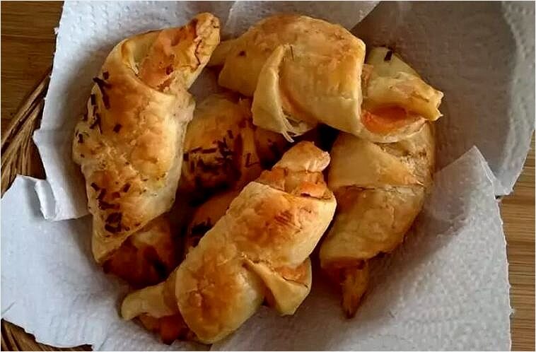Лосось нарезать тонкими ломтиками, выложить на крем. Тесто с начинкой разрезать на 4-8 частей. Скрутите каждый сектор в трубочку от края к центру.