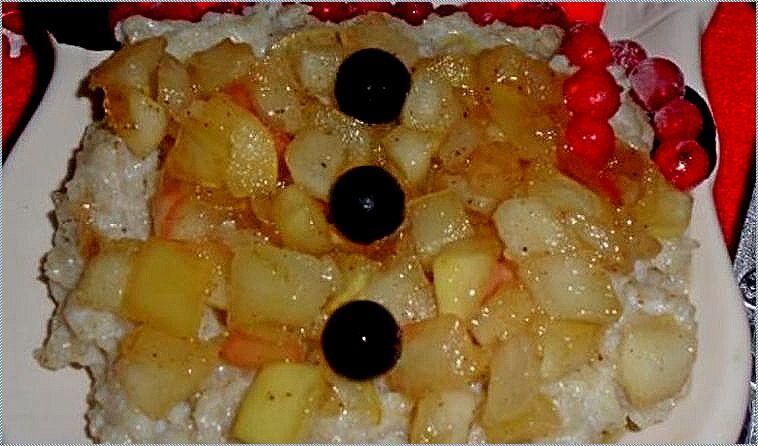 Раскладываем молочную кашу по тарелкам. Поверх каши выложите карамелизированные яблоки. Украсить ягодами. При