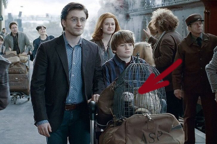 Хорек В фильме "Гарри Поттер и Кубок огня" лже-Грюм из-за своей ненависти к Люциусу Малфою решил отыграться на его сыне Драко, который, к тому же, спровоцировал Барти Крауча-младшего. В сцене, где Малфой-младший решил напасть на Гарри Поттера со спины, вмешался лже-Грюм и превратил Драко в хорька. Похоже, самому Гарри это настолько понравилось, что он решил купить своему сыну Альбусу Северусу Поттеру хорька. Полнолуние В начале фильма "Гарри Поттер и Узник Азкабана" герои впервые сталкиваются с дементором, который сразу же пускает в ход свое главное оружие - поцелуй дементора. Страшно представить, какие последствия могли произойти с Гарри, не будь рядом спящего Люпина. При этом спал Римус не просто так. Действие этой сцены происходит 1 сентября 1993 года, а прошлой ночью было полнолуние, из-за которого Римус, естественно, просто не выспался. Шарфы Крис Коламбус в первых двух фильмах добавлял детали, которые при первом просмотре незаметны, однако обрисовывают картину на подсознательном