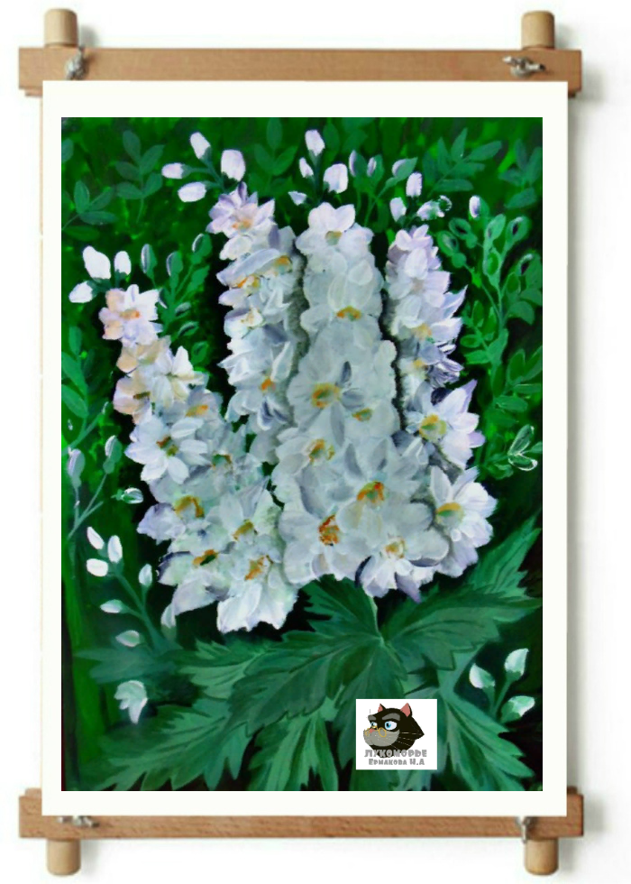 Кисть можно помыть, слегка прижать к тряпочке и набираем на неё белую гуашь. Лёгкими мазками будем строить композицию, наметим очертания соцветий дельфиниума.