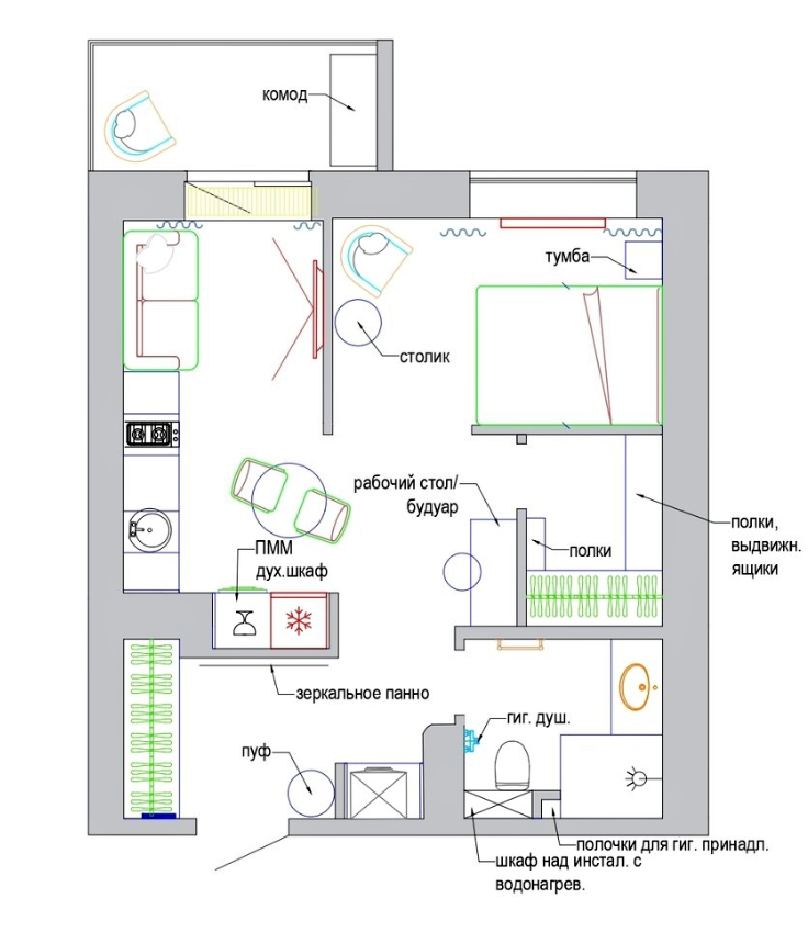 Эта квартира принадлежит маме нашей героини. Так как квартира была в ужасном состоянии, заказчица решила обратиться к профессиональному дизайнеру, чтобы создать стильный, лёгкий и функциональный интерьер на небольшой площади. Проект Чтобы уместить всё необходимое, пришлось делать полную перепланировку пространства. Прихожая Входную группу оформили в светлых тонах. Стены оклеили обоями, а на пол уложили плитку с узорами. С левой стороны от входа установили встроенную систему хранения с деревянными фасадами. В углу этой системы есть небольшой лаз для кошки (там стоит её лоток). Напротив входной двери повесили большое зеркальное панно. Так же в прихожей есть хозяйственный шкаф, где поставили стиральную машину. Кухня-гостиная С левой стороны появилась кухонная зона. Гарнитур выбрали линейный. Верхние фасады выполнены в классическом белом цвете, а нижние выполнены в насыщенном сине-голубом оттенке. Слева установили встроенные функциональные колонны, где находится бытовая техника и места дл
