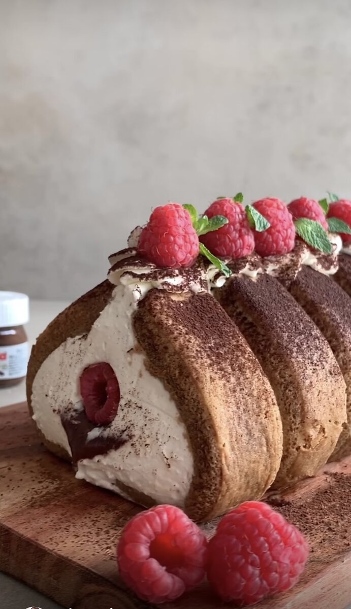 Протрясающий нежный, воздушный, в меру сладкий, тот самый тирамису с самой красивой подачей. Ролл тирамису - с малиновой начинкой и с Нутеллой. Нам понадобится: Для начинки: Для украшения: Завариваем растворимый кофе и даем остыть. Кофе должен быть комнатной температуры. На столе или большом подносе выстилаем пленку и несколько слоев и рядов. Обмакиваем печения по штучно в кофе и выкладываем рядами. По 12 штук с каждой стороны. Накрываем пленкой, чтобы печенья хорошо пропитались и стали немного мягкими. Это нам понадобится для формирования особой формы. В большой миске взбиваем сливки до пиков, аккуратно вводим маскарпоне и все хорошо перемешиваем. Далее добавляем столовую ложку сахарной пудры ( если любите послаще можно добавить больше) и одну чайную ложку ванильно экстракта. Снова все хорошо перемешиваем до получения однородной массы. Снимаем пленку с наших печений и выкидываем всю начинку на печенья. Разравниваем. С помощью кондитерского мешка ровно на середину выклад