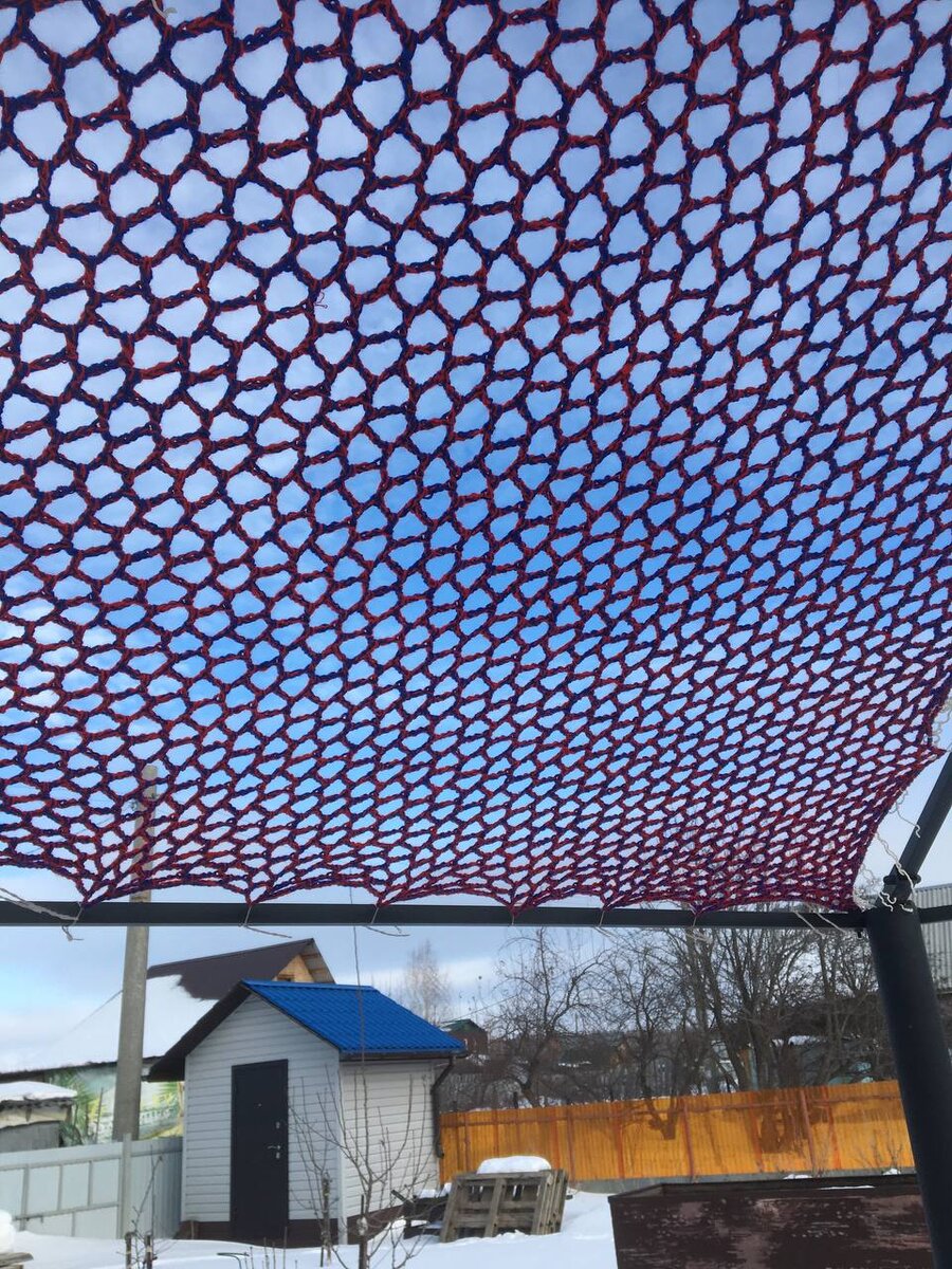Все 6 граней будут меланжевые, но не одинаковые. Две сине-красные, а остальные пока не знаю точно! Жаль день был пасмурный, но это не испортило настроения! Мы перетащили стол в беседку с которого и привязывали сетку!