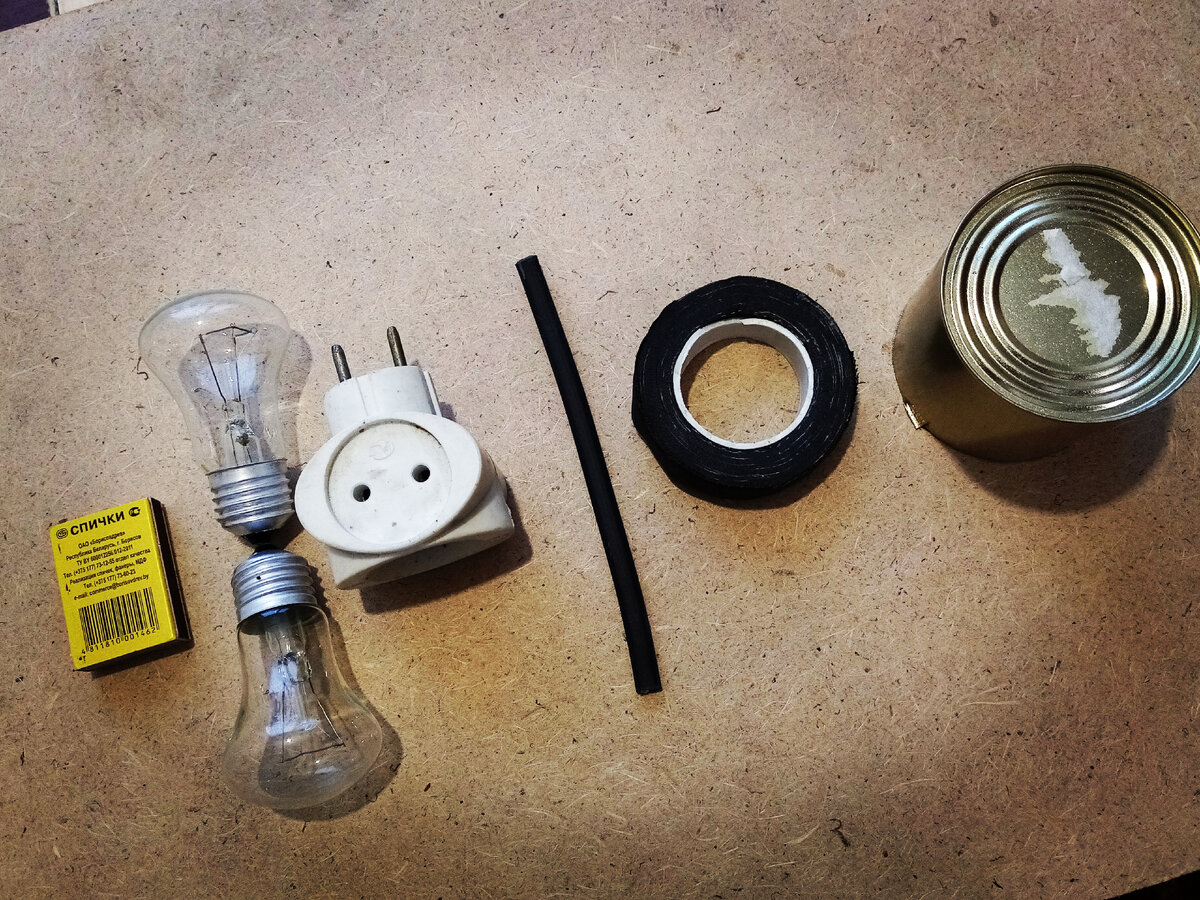 Знакомый, отбывавший когда-то в местах заключения, рассказал про невероятную самоделку, которую они прятали и согревались ей в холодное время. Решил воспроизвести такую же, по его подробному описанию. Ниже на фото, я собрал все что для этого потребуется. Согласитесь, не так уж и много. Начнём с зачистки провода от изоляции. По рассказу знакомого, это была аллюминиевая проволока, но таковой я не нашёл, а в случае с медью, думаю будет не хуже. Получилось две медных проволочки длиной 20 см. Теперь их надо будет обогнуть вокруг цоколя каждой из лампочек и скрутить концы как на фото. С помощью спичек и изоленты скрепляю лампочки цоколем друг к другу. На практике же, все заматывалось простой ниткой для шитья. Теперь нам понадобится пустая, консервная банка. Вырезаю в ней донышко так, чтобы она могла им надеться на розетку или в моём случае, тройник. И ещё два разреза вдоль, деля банку как-бы, на две равных части. И разгибаю их в стороны. То что получилось, надеваю на тройник и фиксирую