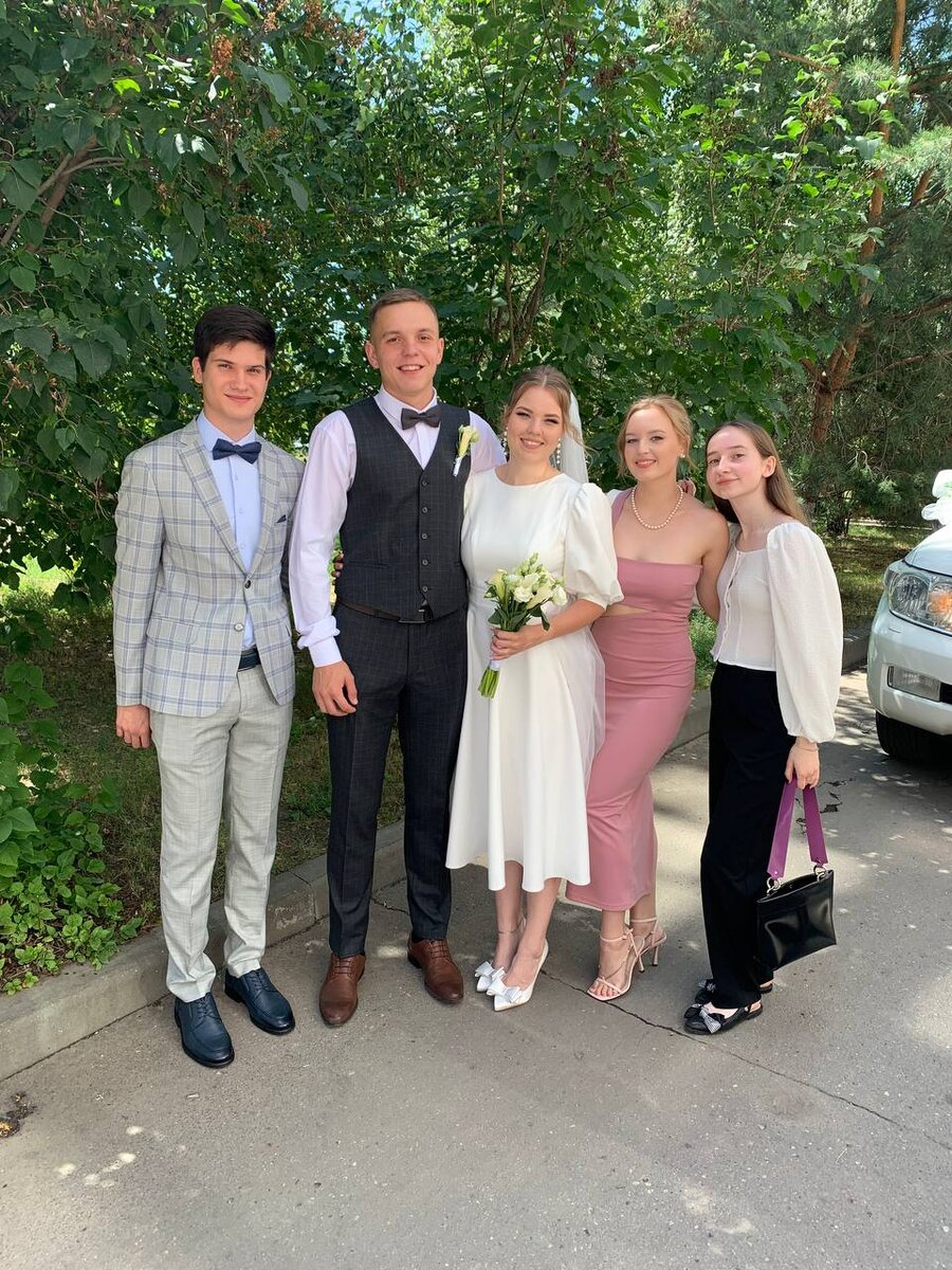 На улице мы ещё раз сфотографировались и поехали в ЗАГС. Настроение было отличным! Подъехали к ЗАГСу, там нас уже ждали родные, друзья и фотограф. Глаза разбегались... не знаешь куда и на кого смотреть, ведь все смотрели только на виновников торжества - на нас🤵♂️👰♀️ Немного постояв на улице, все начали заходить внутрь. Хочется отметить, что погода в тот день была полностью на нашей стороне🌞 Весь день было солнышко, голубое небо и самая благоприятная температура воздуха🌡 Внутри нас встретила прекрасная девушка, которая рассказала когда входить и куда вставать😄 Ну а дальше самый торжественный момент росписи и танец🥰 P.S. Пишу сейчас и в душе так тепло и трепетно, когда вновь вспоминаю этот день и смотрю фотографии с видео🤩 Затем все спустились вниз, а мы с мужем остались на фотосессию. Кстати говоря, мы специально покупали коробочку для колец, и тоже на Wildberries. По-моему, выглядит очень мило☺️ После фотосессии мы спустились вниз, муж как и положено вынес меня на руках и