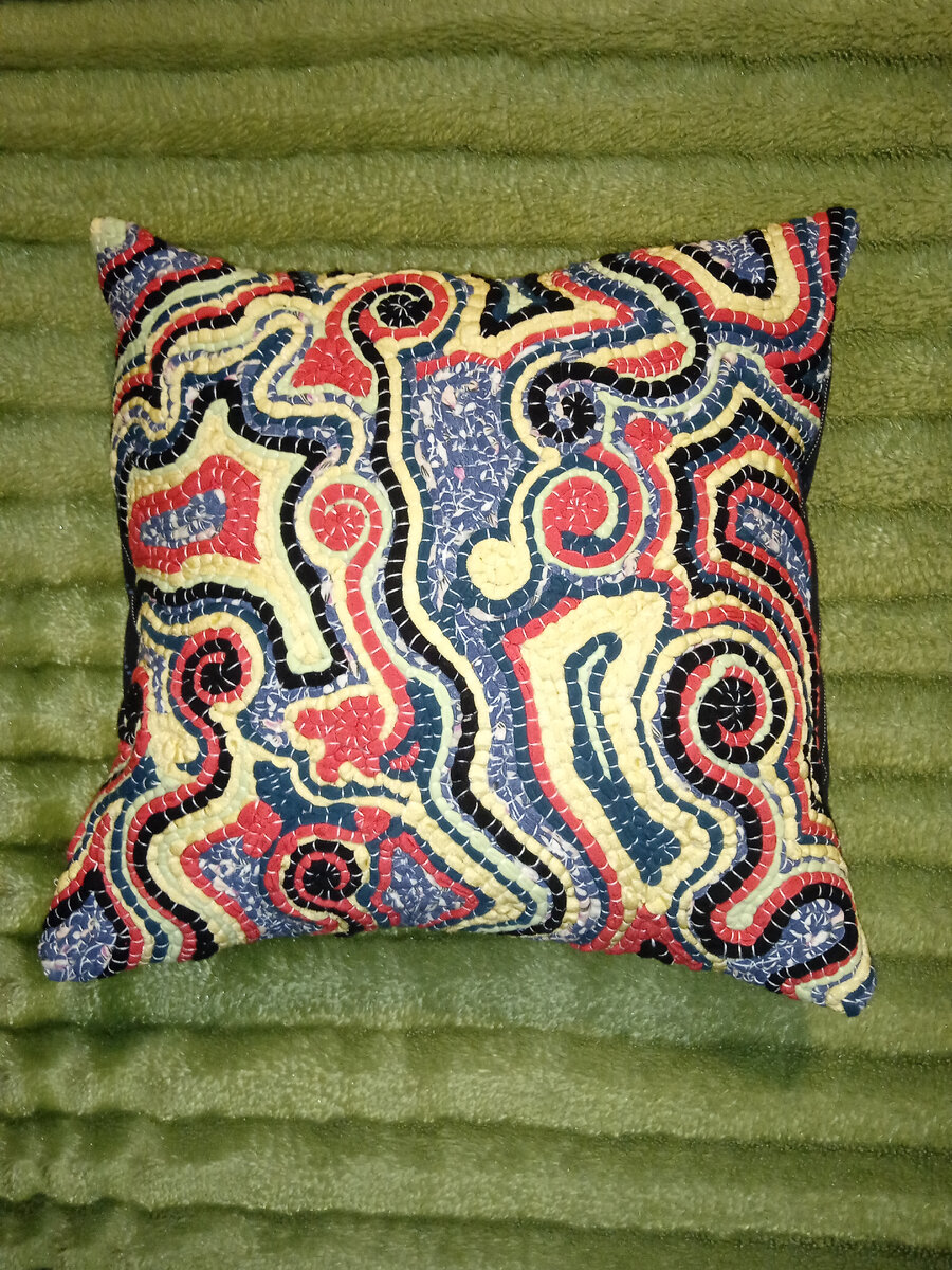 Давно хотела попробовать эту технику. Времени занимает много, но результат вполне приемлемый. Хотя, для первого раза можно было делать вышивку размером поменьше. Сначала необходимо нарезать ненужные трикотажные футболки вдоль низа изделия на полосы шириной около трех - четырех сантиметров. Затем вытянуть полосы так, чтобы они свернулись в жгутики. Заготовить жгутики всех тех цветов, которые будут использованы в вышивке. Основа - кусок ткани необходимиго размера. У меня - 45см на 45 см. Ткань тонкая, но прочная. Жгутики трикотажа просто пришиваем к основе. Я не придумывала рисунок заранее, шила интуитивно. Основной рисунок - спирали, затем просто заполняла пустоты. Какой-то один цвет можно использовать для вышивки фона. В моем случае, фоном стал синий трикотаж с белым рисунком. Готовая вышивка немного меньшего размера, чем изначальная основа. У меня с 45см уменьшился до 42см. Из готовой вышивки я сделала наволочку на декоративную подушку. Выкроила две детали задней стороны наволочки. О